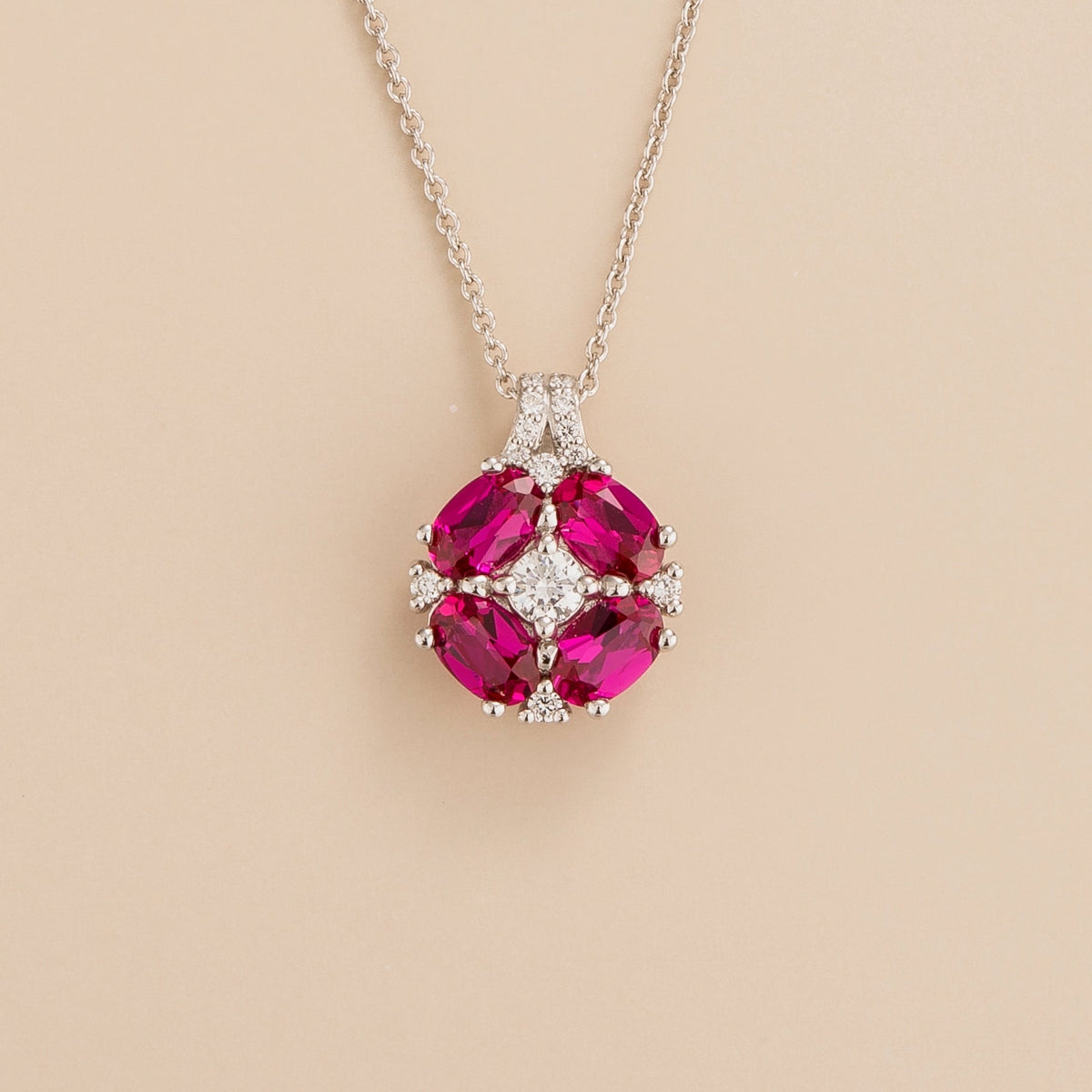 The Pristi White Gold Necklace by Juvetti is a stunning pendant necklace that combines elegance and brilliance. Crafted in 18K white gold vermeil, it is set with sparkling Diamonds and vibrant Rubies. The pendant comes on an adjustable chain and is designed to preserve its original brilliance over time.