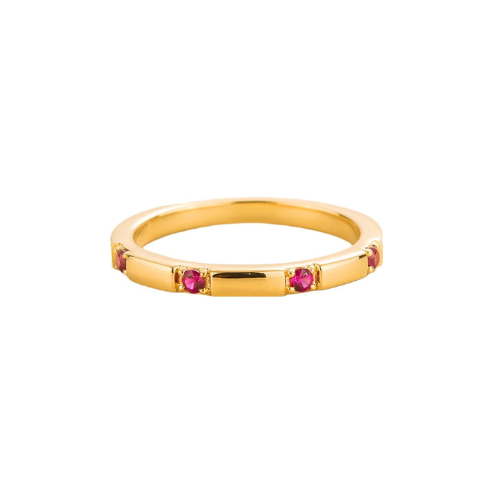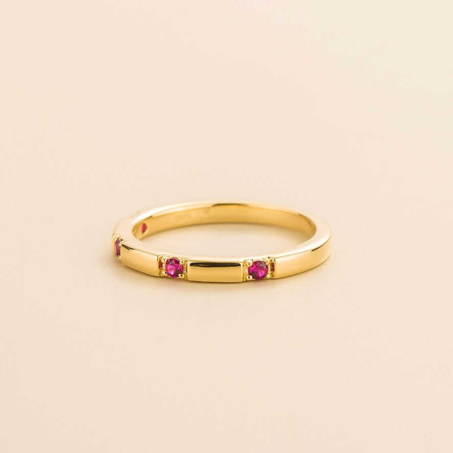 Crafted from 18K gold vermeil with four 1.8mm round rubies (approximately 0.16 carats total weight). The band is 2.1mm width x 1.7mm thick.