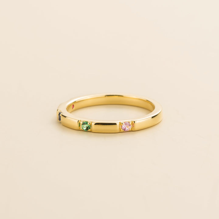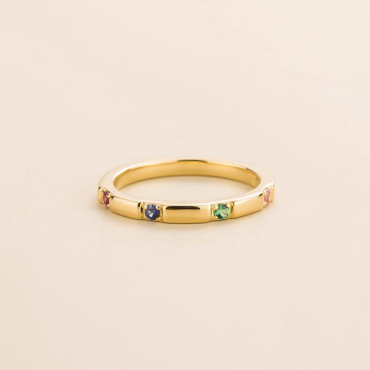 Crafted from 18K gold vermeil and features ruby, blue sapphire, emerald, and pink sapphire gemstones. The band is 2.1mm width x 1.7mm thick.