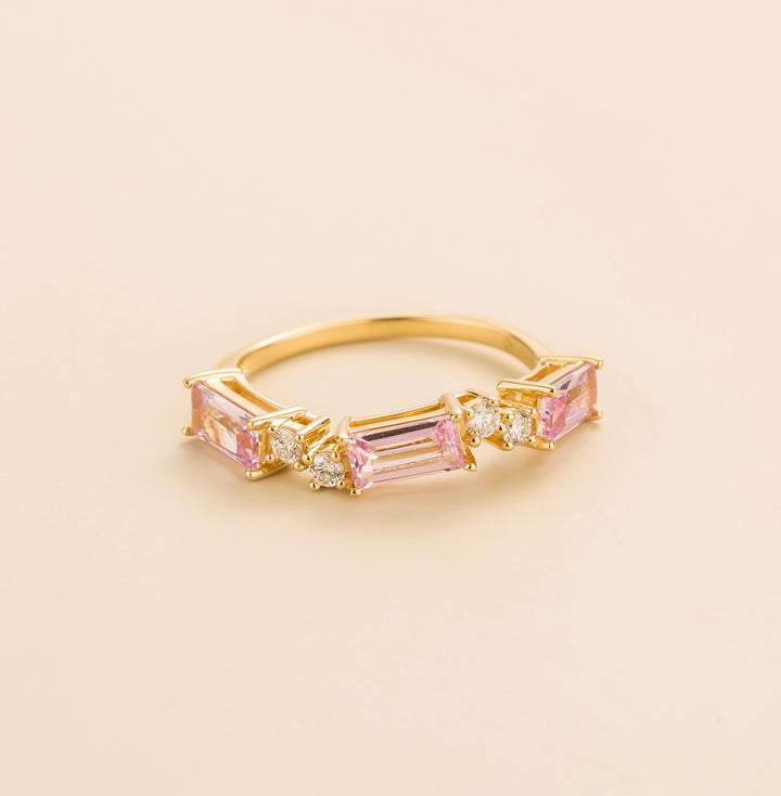 The Forma Ring In Pink Sapphire & Diamond Set In Yellow Gold by Juvetti is a luxurious and elegant ring. It features three beautiful baguette-cut pink sapphires and four brilliant round diamonds, all set in 18K gold vermeil. The combination of the bold pink sapphires and sparkling diamonds creates a modern and sophisticated look that is perfect for any occasion.