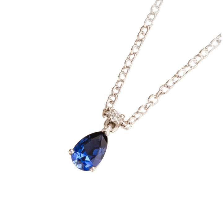 Crafted from 18K white gold vermeil. It features a 0.51-carat blue sapphire (6mm x 4mm pear cut) and a 0.03-carat diamond (1.5mm round cut). The pendant measures 9.5mm height x 4.5mm width x 3.9mm depth. The chain is 16-18 inches long.