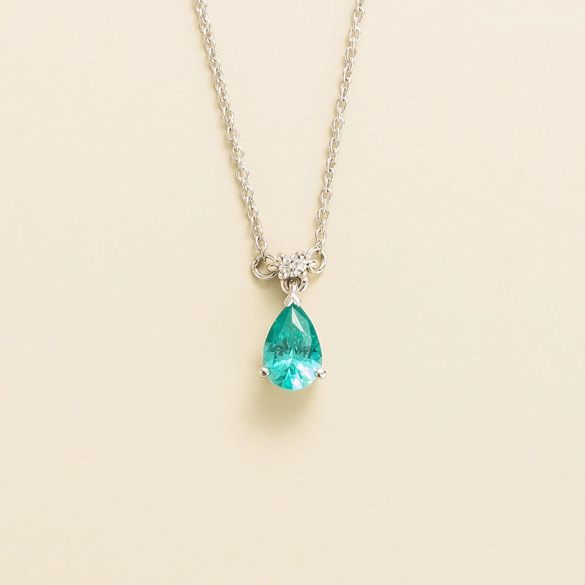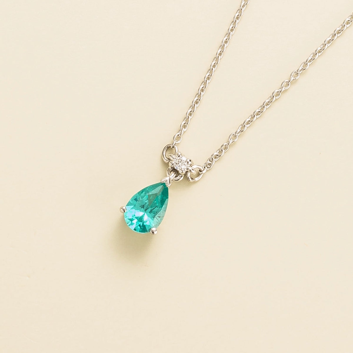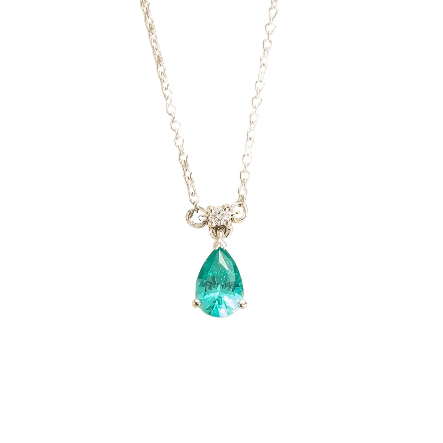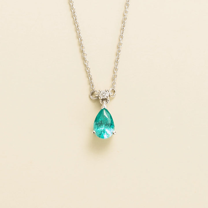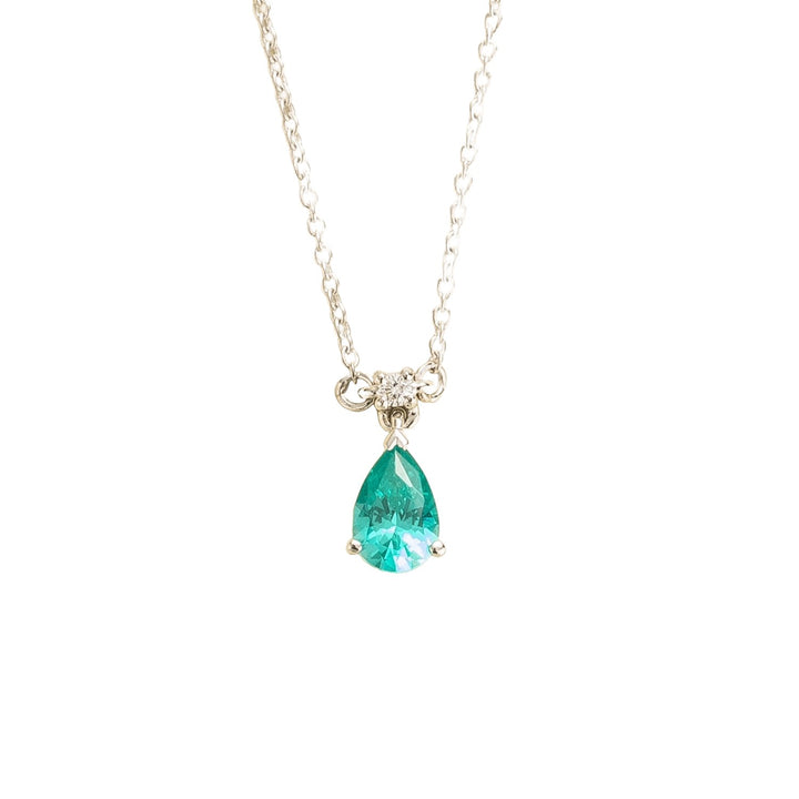 Crafted from 18K white gold vermeil. It features a 0.51-carat Paraiba sapphire (6mm x 4mm pear) and a 0.03-carat VS grade diamond (1.5mm round). The adjustable chain is 16-18 inches long.