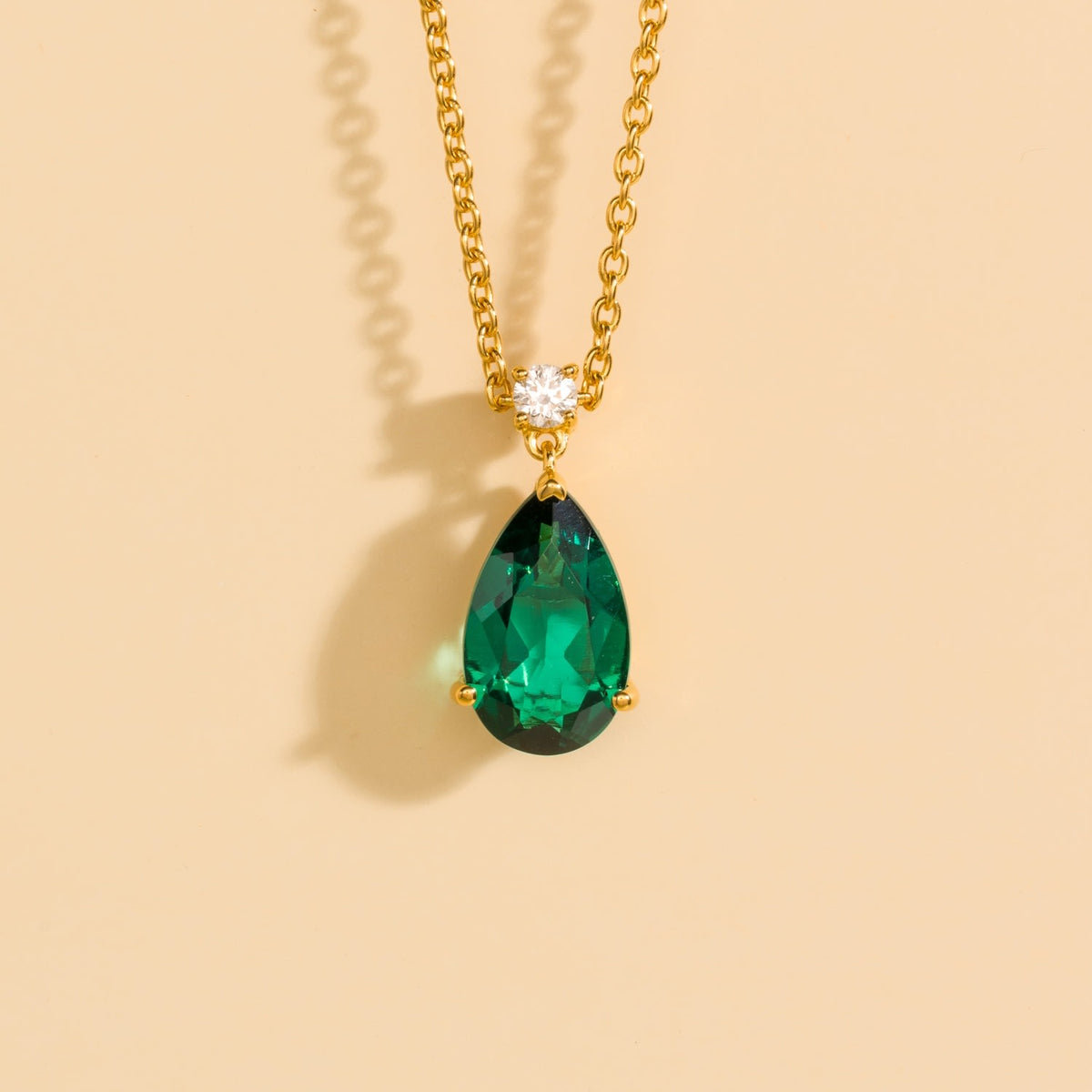 Crafted from gold. It features an emerald (approximately 3.0 carats, 13mm x 8mm pear) and a VS grade diamond (approximately 0.10 carats, 3mm round). The adjustable chain is 16-18 inches long.