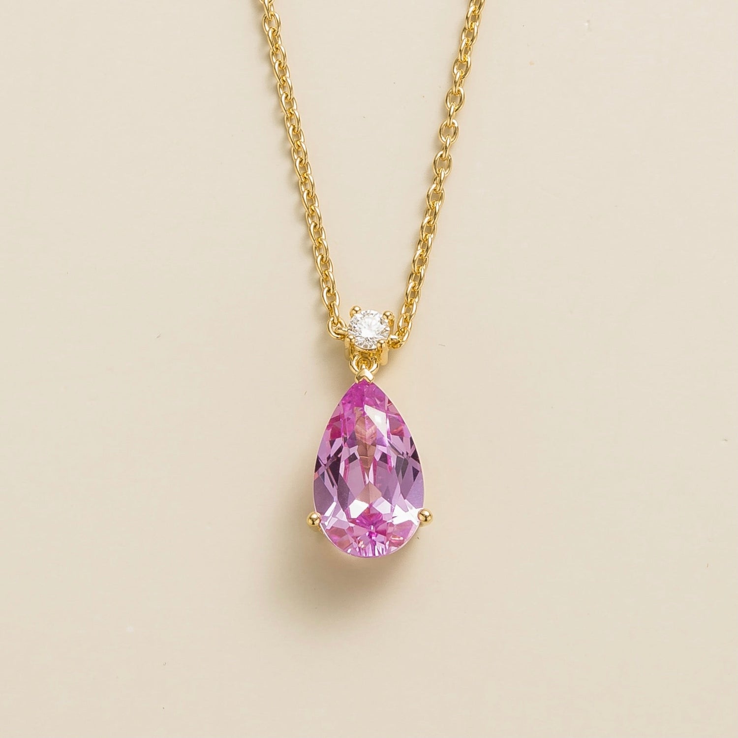 Crafted from 18K gold vermeil. It features a 4.75-carat pear-cut pink sapphire and a 0.10-carat round-cut diamond. The adjustable chain is 16-18 inches long.