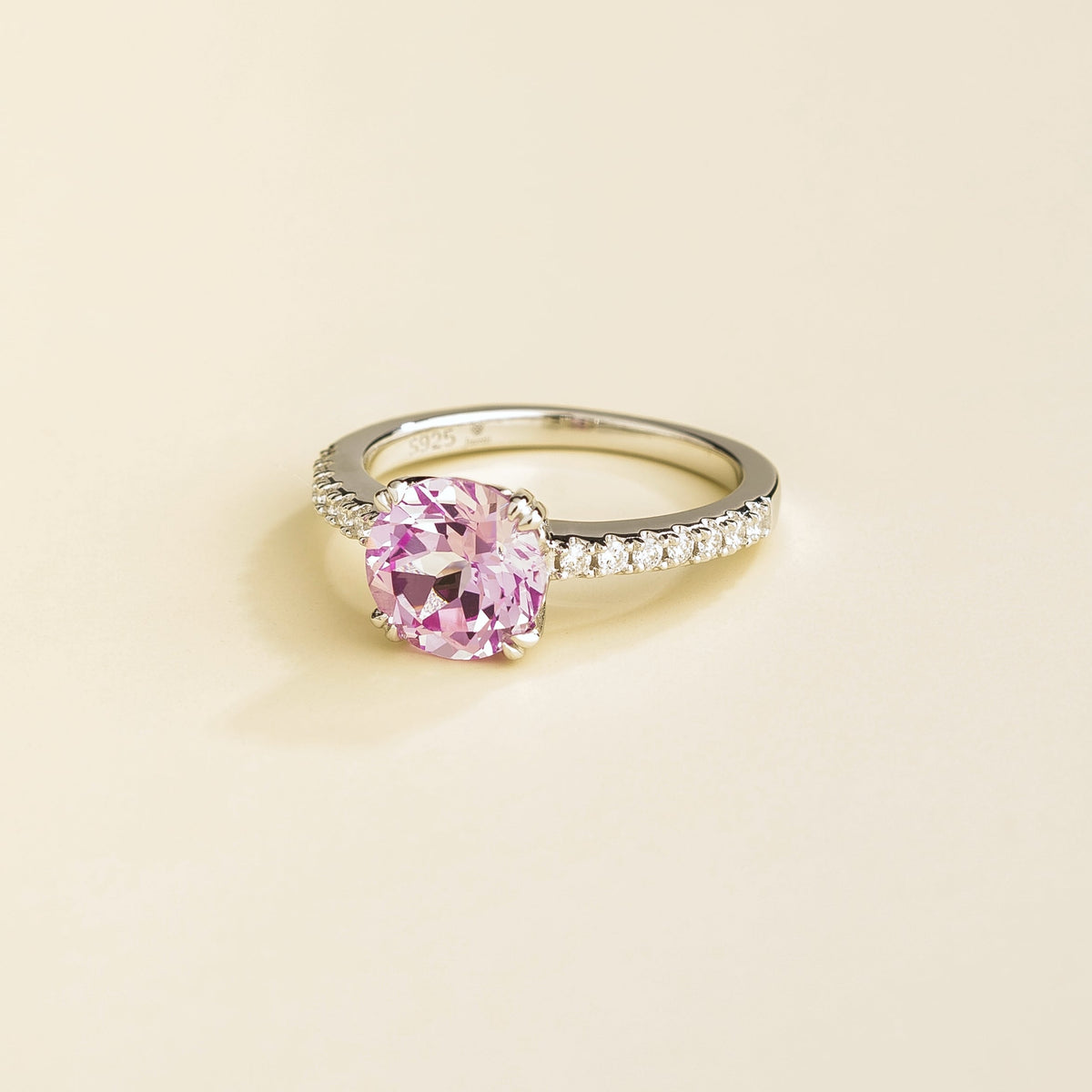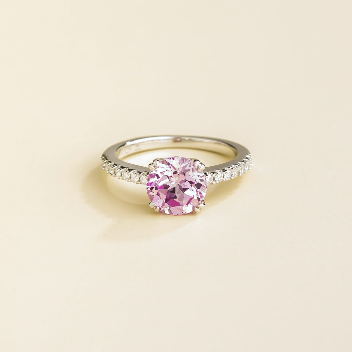 This ring is made from 18K white gold vermeil. It is set with a pink sapphire of approximately 2.25 carats and VS-grade diamonds of approximately 0.24 carats. The crown measures 8.0mm in width and 6.8mm in depth, with a band of 2.0mm in width and 1.5mm in thickness.