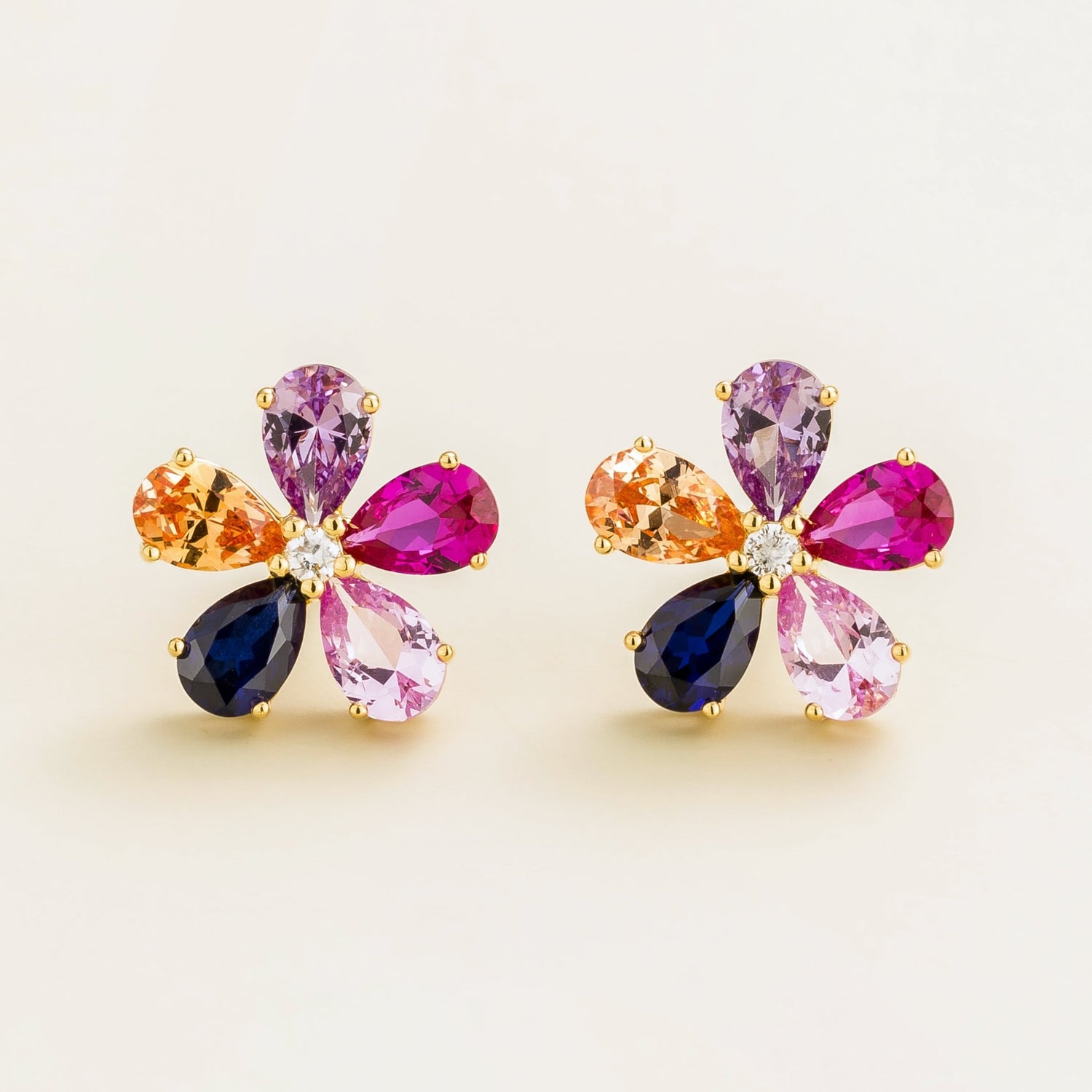 These Florea Gold Earrings by Juvetti are a vibrant and luxurious floral statement. The exquisite design, symbolizing happiness, is set with a beautiful mix of diamonds and blue, pink, and champagne sapphires. The warm gold vermeil setting enhances the rich colors, creating a piece that is both sophisticated and radiantly glamorous.