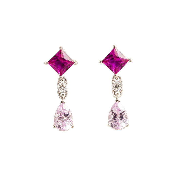 These Ori White Gold Earrings Pink Sapphire & Diamond by Juvetti are a statement of mesmerising simplicity. The elegant white gold vermeil setting beautifully showcases the princess and pear-cut pink sapphires, complemented by brilliant diamonds. This piece offers a refined and sophisticated look that is perfect for adding a touch of subtle color and sparkle to your style.