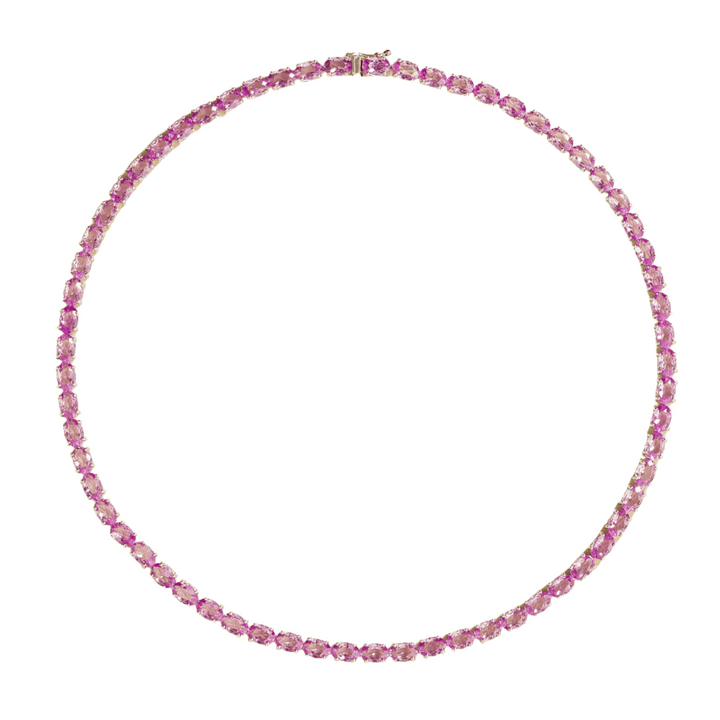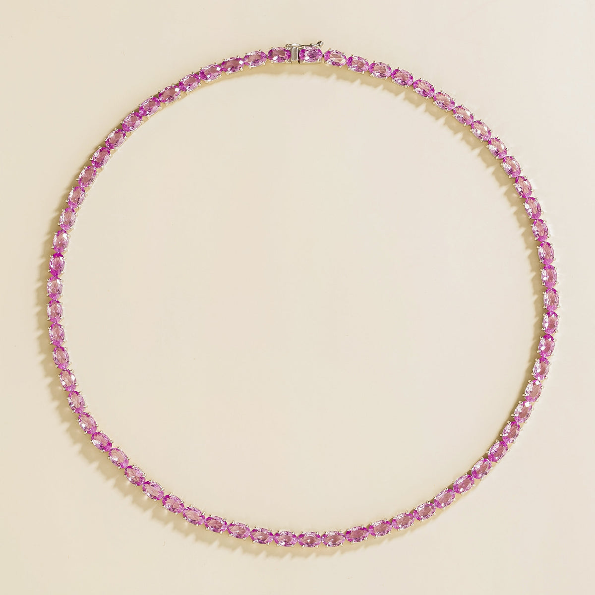 Crafted from 18-karat white gold vermeil, this necklace is set with approximately 18 carats of 6mm x 4mm oval pink sapphires. It is 16 inches in length.