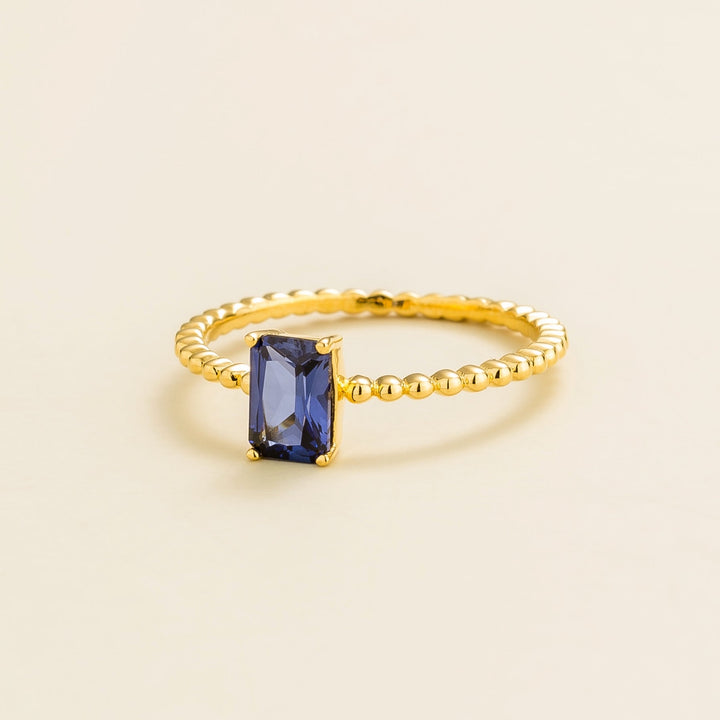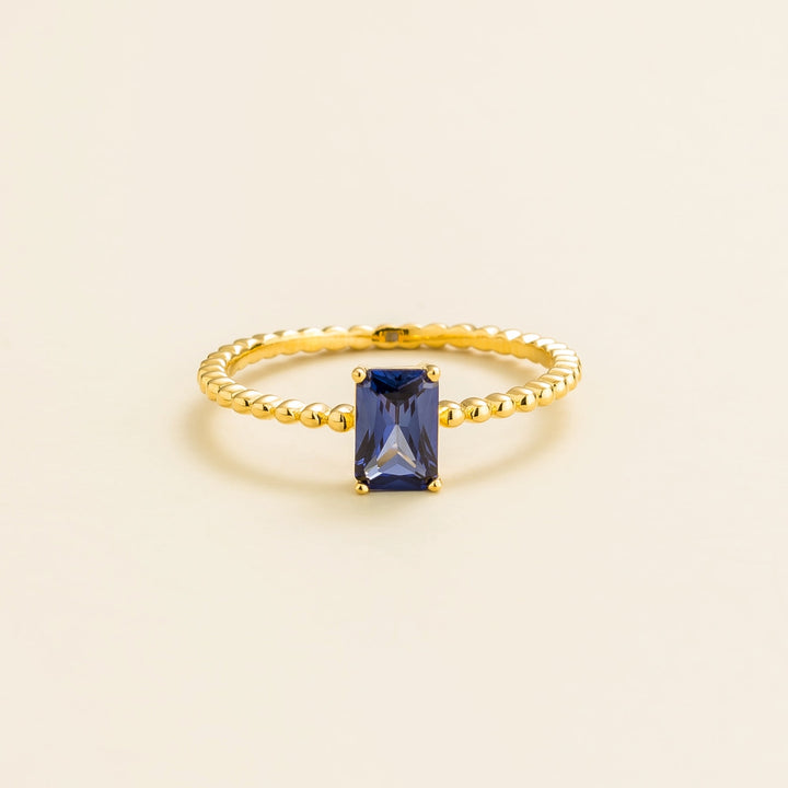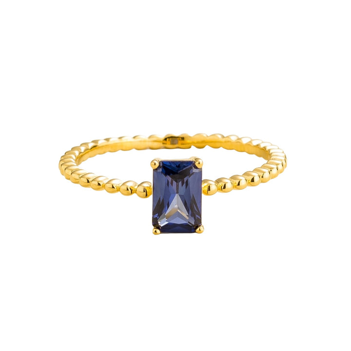 This Buchon Gold Ring by Juvetti is a beautiful and modern piece. Its delicate "bubble beaded" design is set with a striking emerald-cut blue sapphire. The ring's unique and captivating design adds a touch of sophistication and color to any look, and it is a perfect complement to the matching necklace and earrings from the same collection.