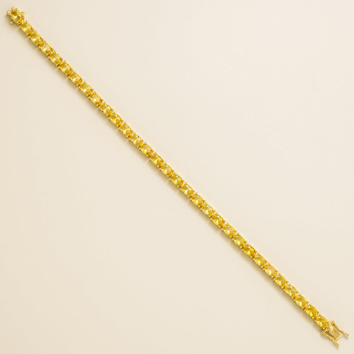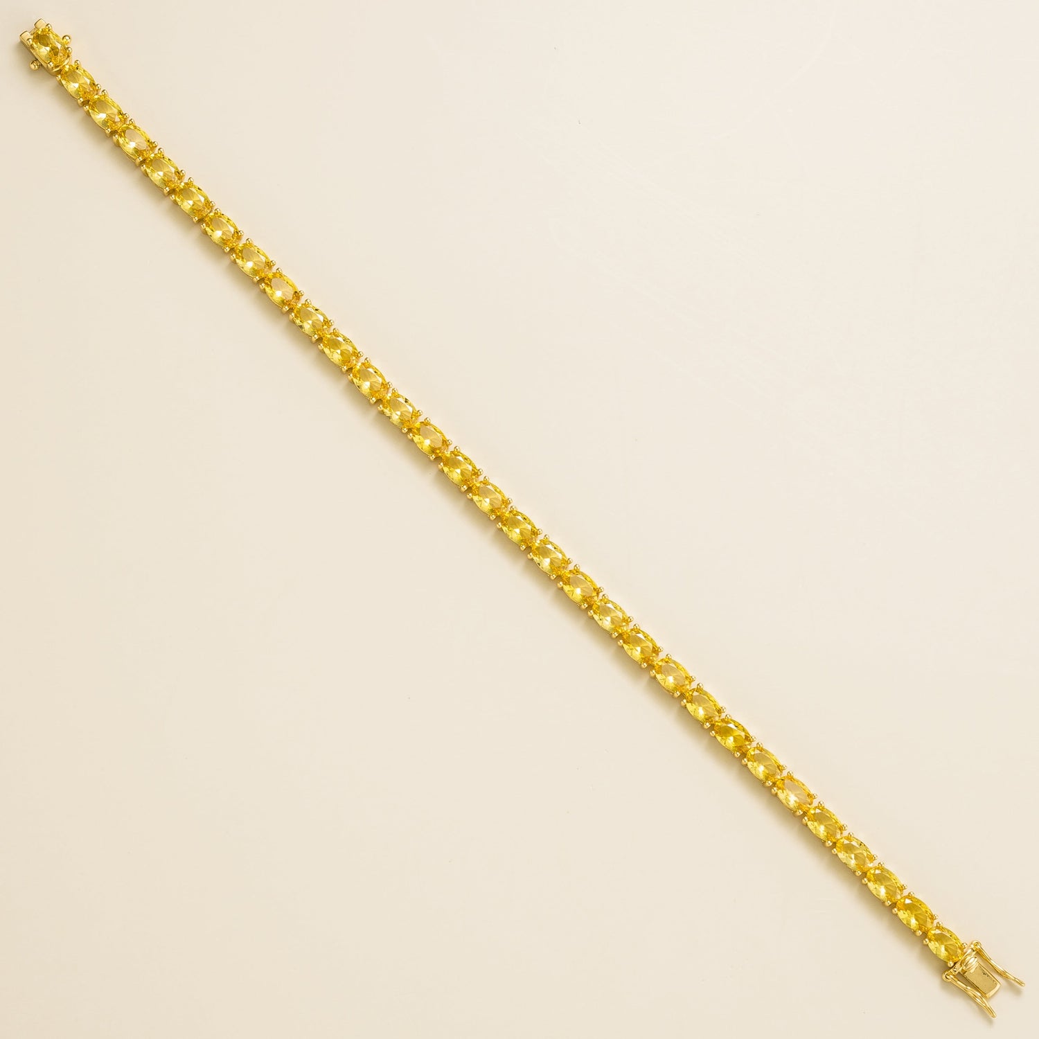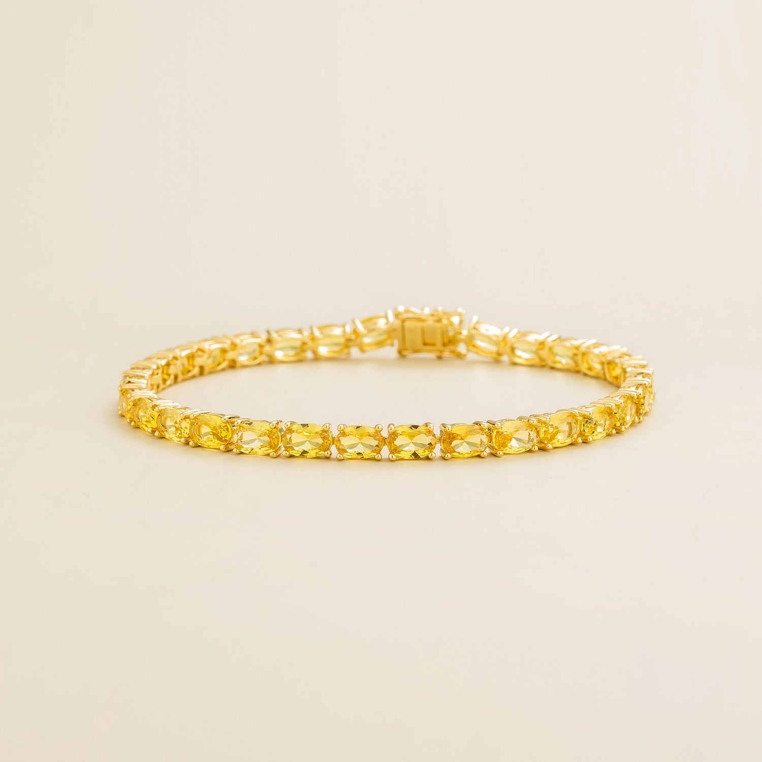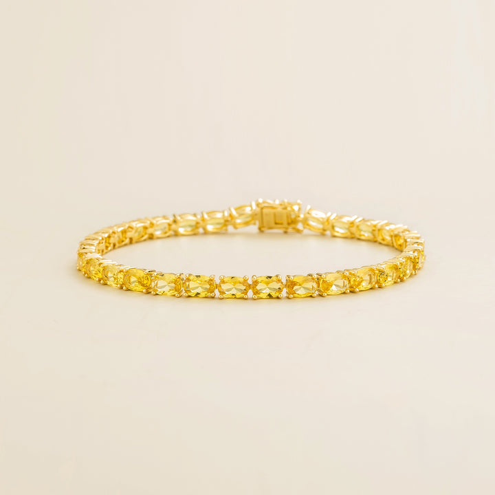 This bracelet is crafted from 18K gold vermeil and is set with approximately 18 carats of oval-cut yellow sapphire gemstones. It is 7.5 inches long.