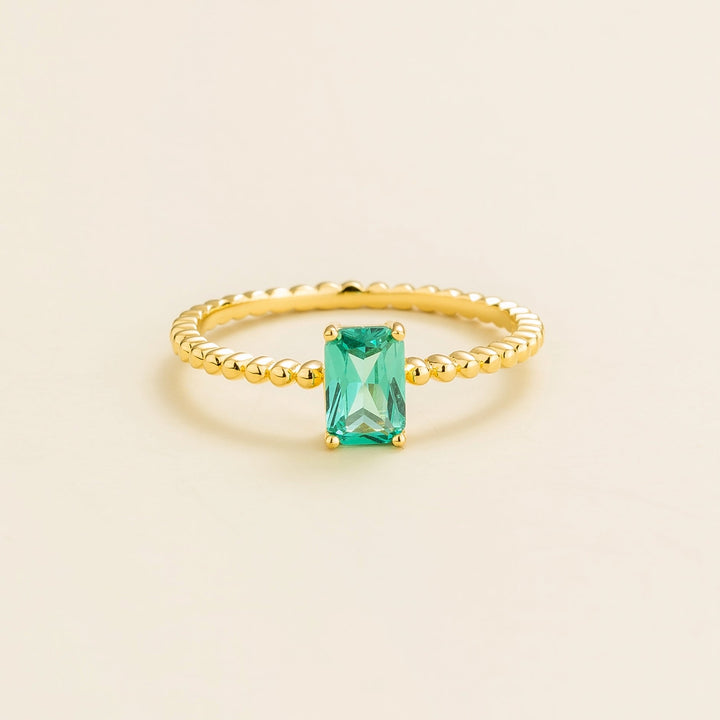 The Buchon Gold Ring by Juvetti is a stunning bubble-beaded ring with a beautiful Paraiba sapphire. The emerald-cut sapphire is set in a ring with a delicate and intricate design. This ring is a statement of modern luxury and is part of a matching set with a necklace and earrings.