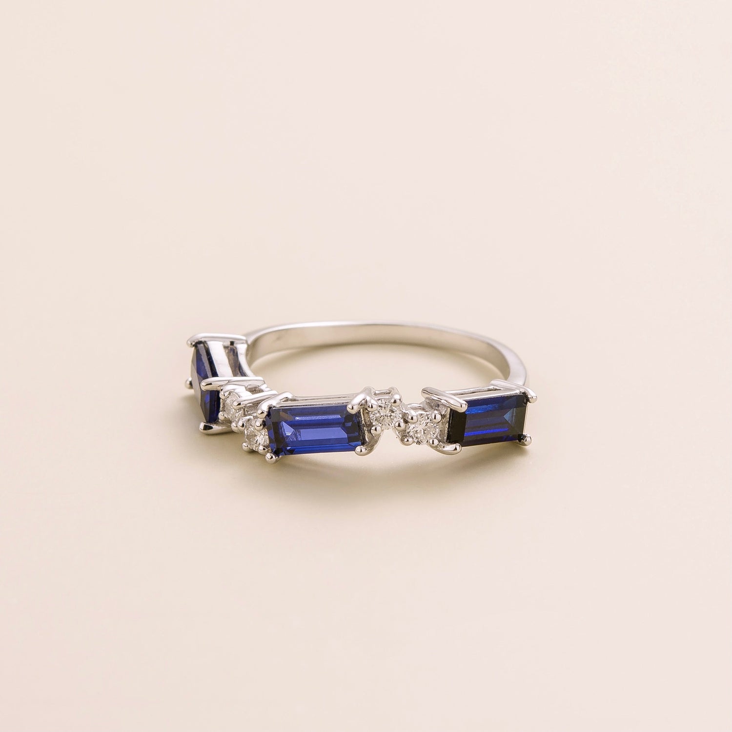 This ring is crafted from 18K white gold vermeil and is set with blue sapphires (1.45 carats) and diamonds (0.16 carats).
