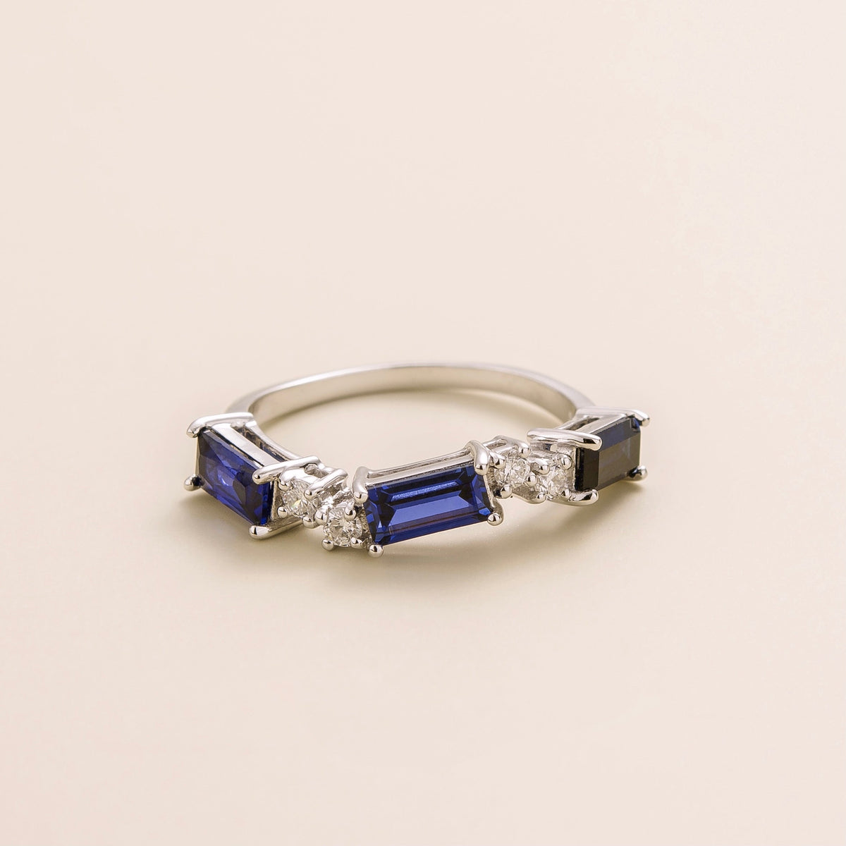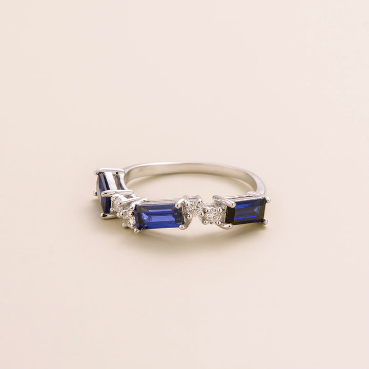 The Forma Ring by Juvetti is a stunning piece that combines blue sapphires and diamonds. The baguette-cut sapphires and round diamonds are set in a beautiful design, creating a ring that is both elegant and eye-catching. This piece is a timeless luxury that is designed to preserve its original brilliance.