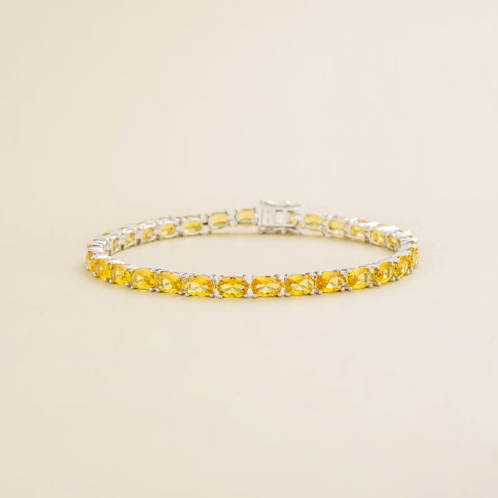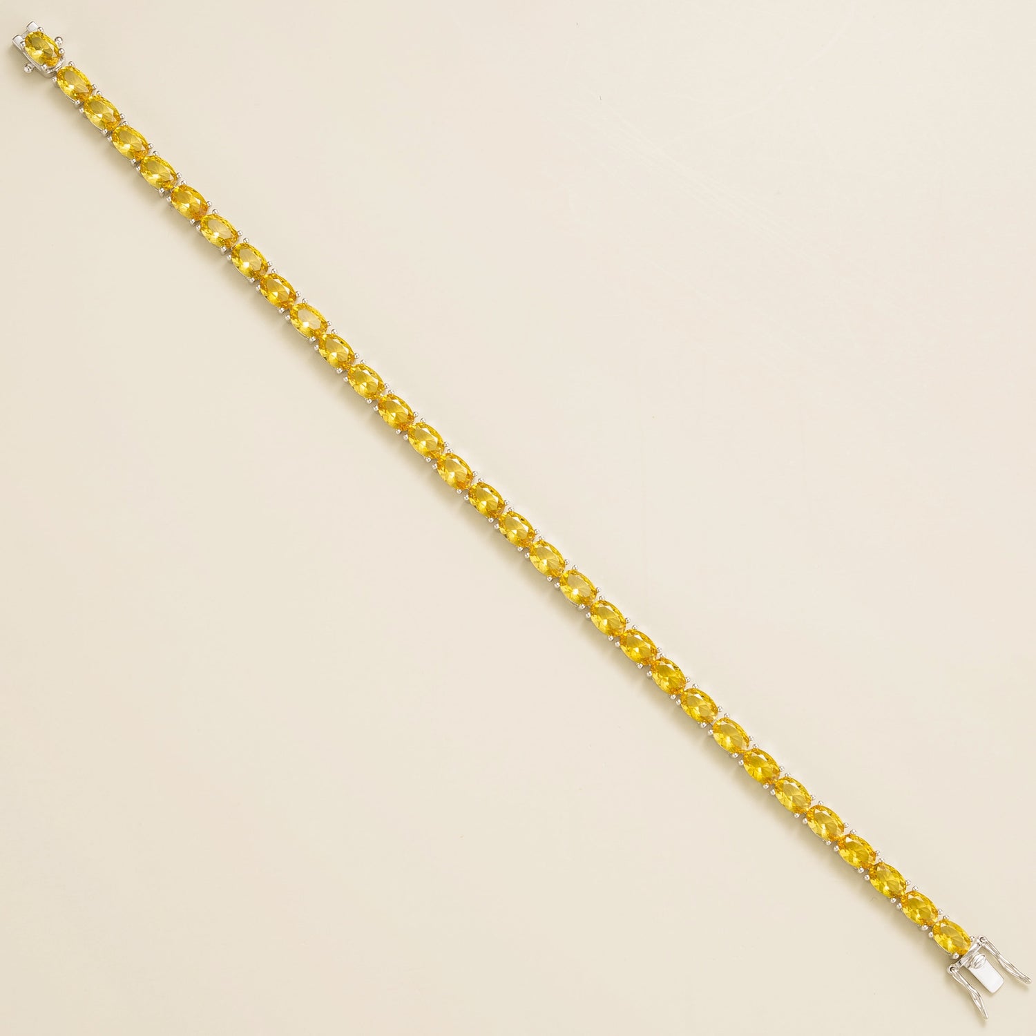 This bracelet is made with 18K white gold vermeil and features approximately 18 carats of oval-cut yellow sapphire gemstones.