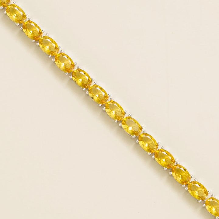 The Salto Tennis Bracelet by Juvetti is a timeless and elegant piece. This classic design features oval-cut yellow sapphires set in 18K white gold vermeil, meticulously handcrafted with intricate attention to detail. Its sophisticated style is perfect for both special occasions and everyday wear.