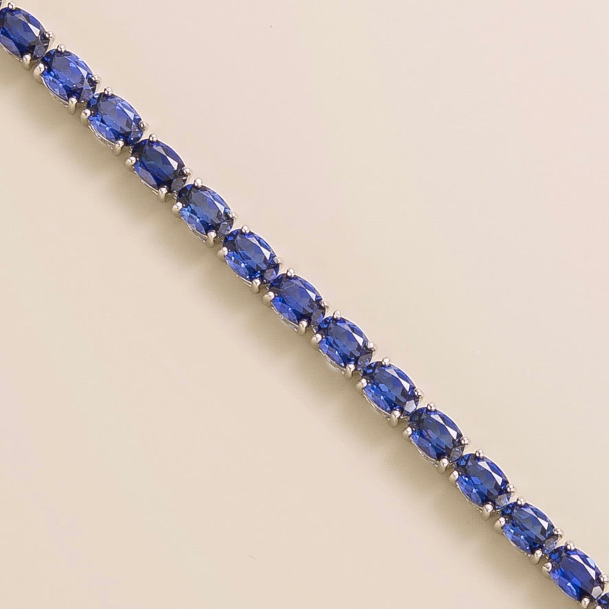 The Salto White Gold Tennis Bracelet by Juvetti is a timeless and elegant piece. It is a classic tennis bracelet design set with beautiful oval-cut blue sapphire gemstones in 18K white gold vermeil. This bracelet is meticulously handcrafted with intricate attention to detail, making it a luxurious and refined accessory.