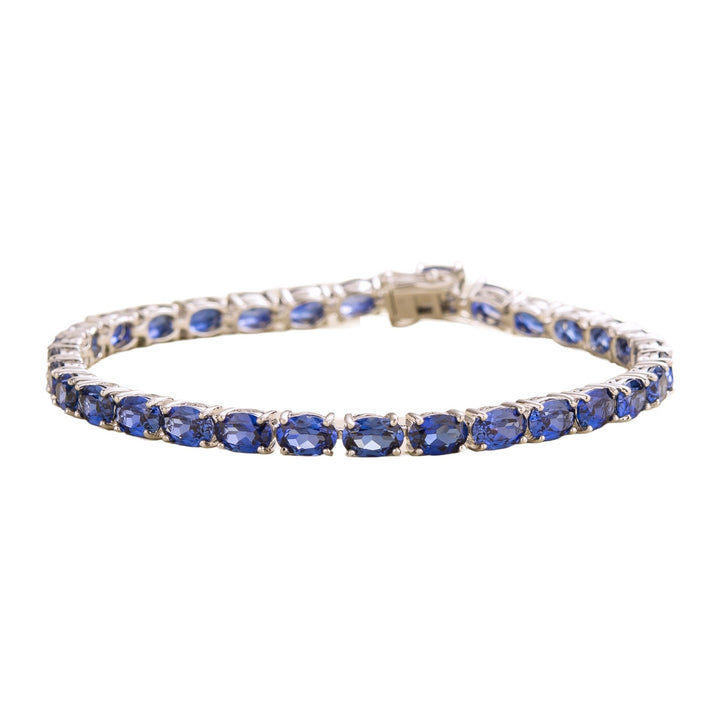 This bracelet is made with 18K white gold vermeil and features approximately 18 carats of oval-cut blue sapphire gemstones.