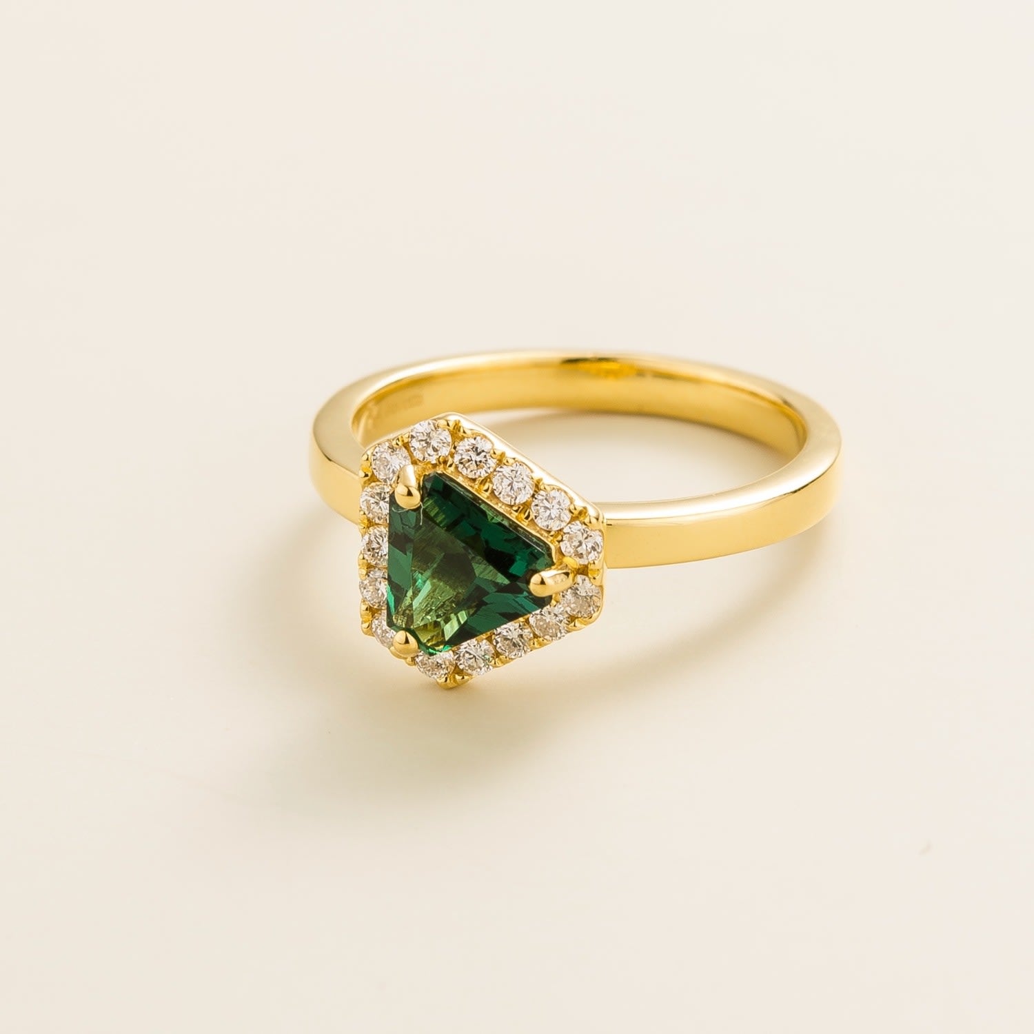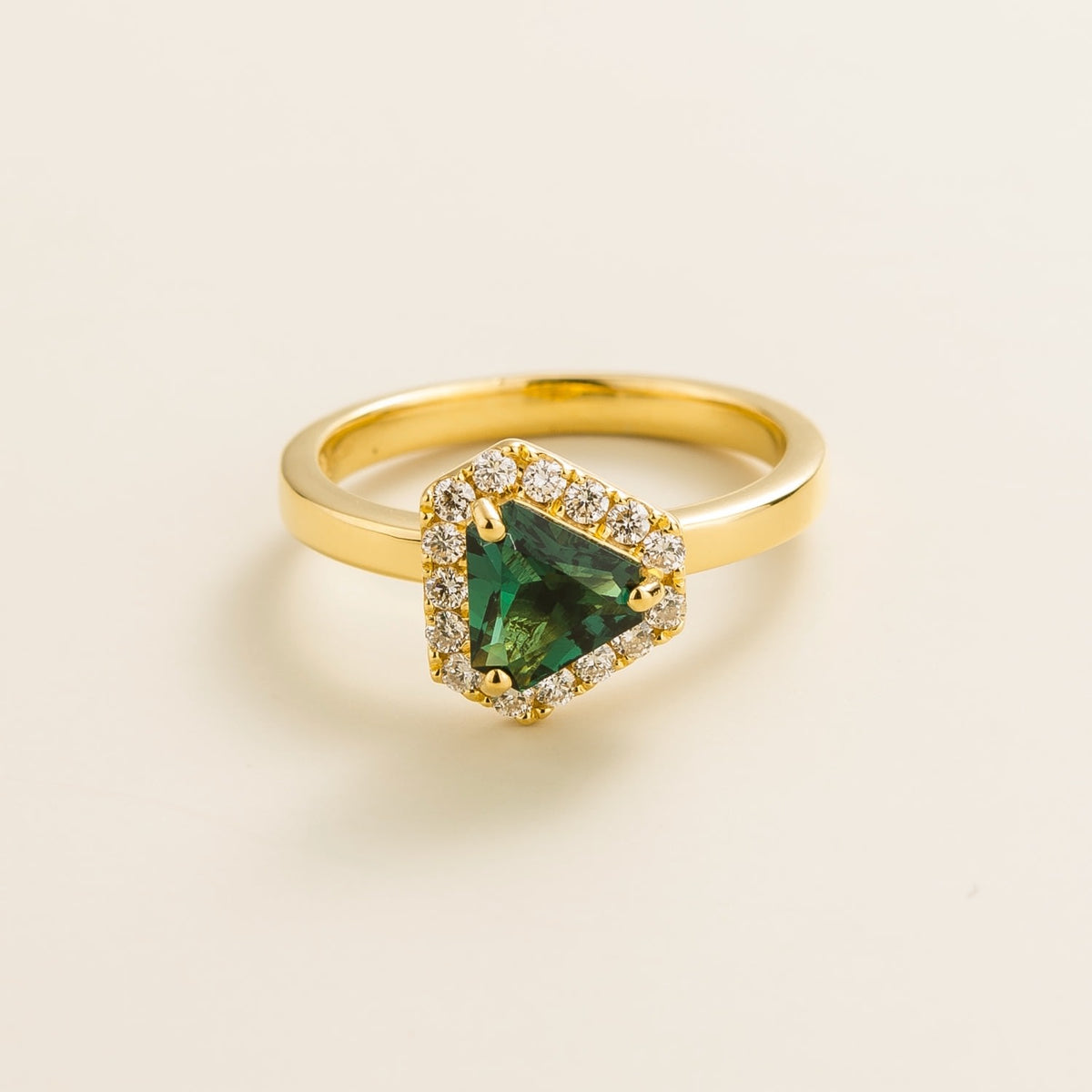 This Diana Ring by Juvetti is a stunning piece that effortlessly bridges the gap between glamorous events and everyday elegance. The gold vermeil setting provides a luxurious backdrop for the beautiful calf-cut emerald and sparkling round diamonds. The classic design with a modern twist makes this ring a perfect statement piece. It symbolizes grace and enduring style, ensuring you look stunning no matter the occasion.