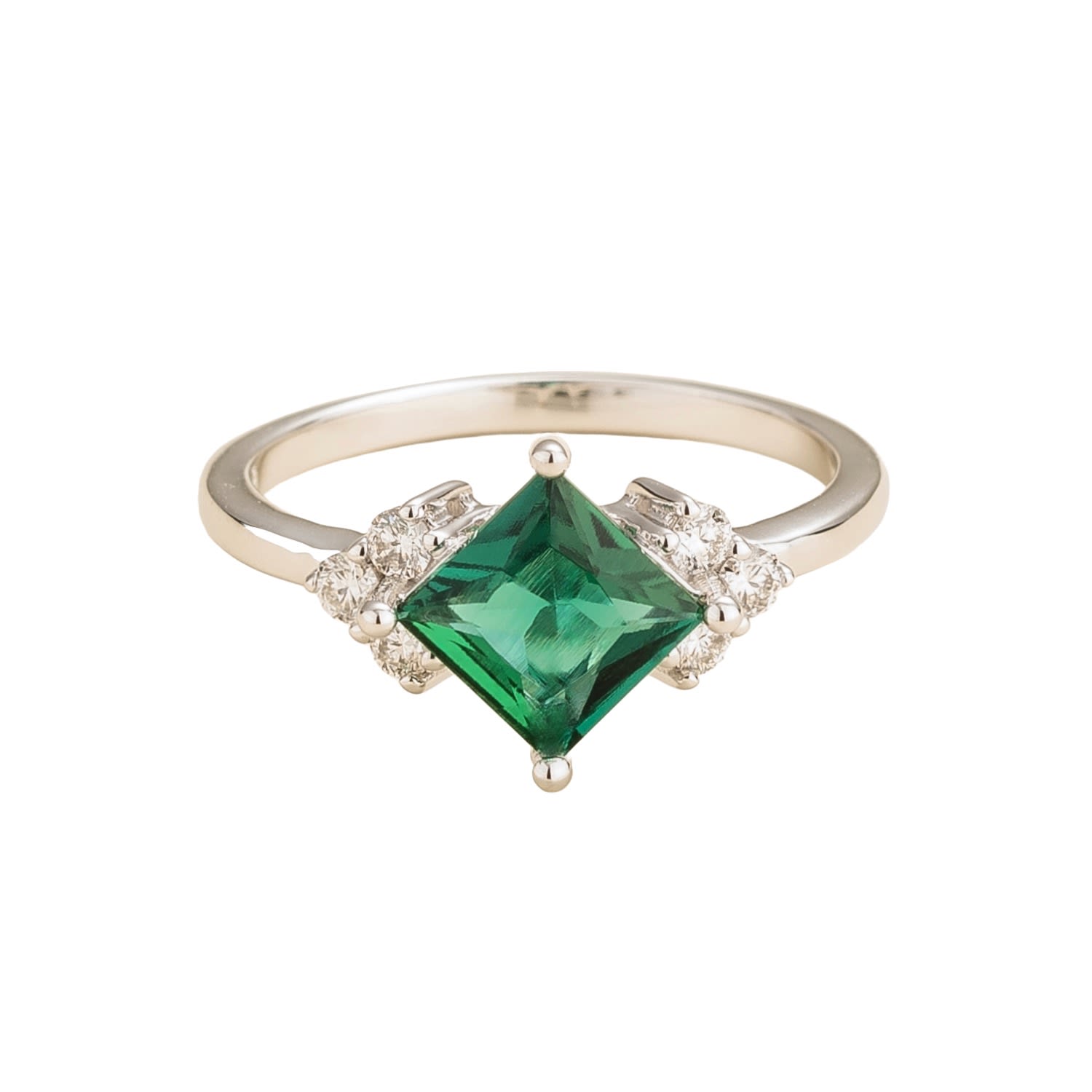 This ring is crafted from white gold and features a 1.30-carat princess-cut emerald (6mm x 6mm) and 0.24 carats of VS+ grade diamonds. The crown measures 13.6mm high x 9.6mm wide x 5.0mm deep, with a band that is 1.7mm wide and 1.6mm thick.
