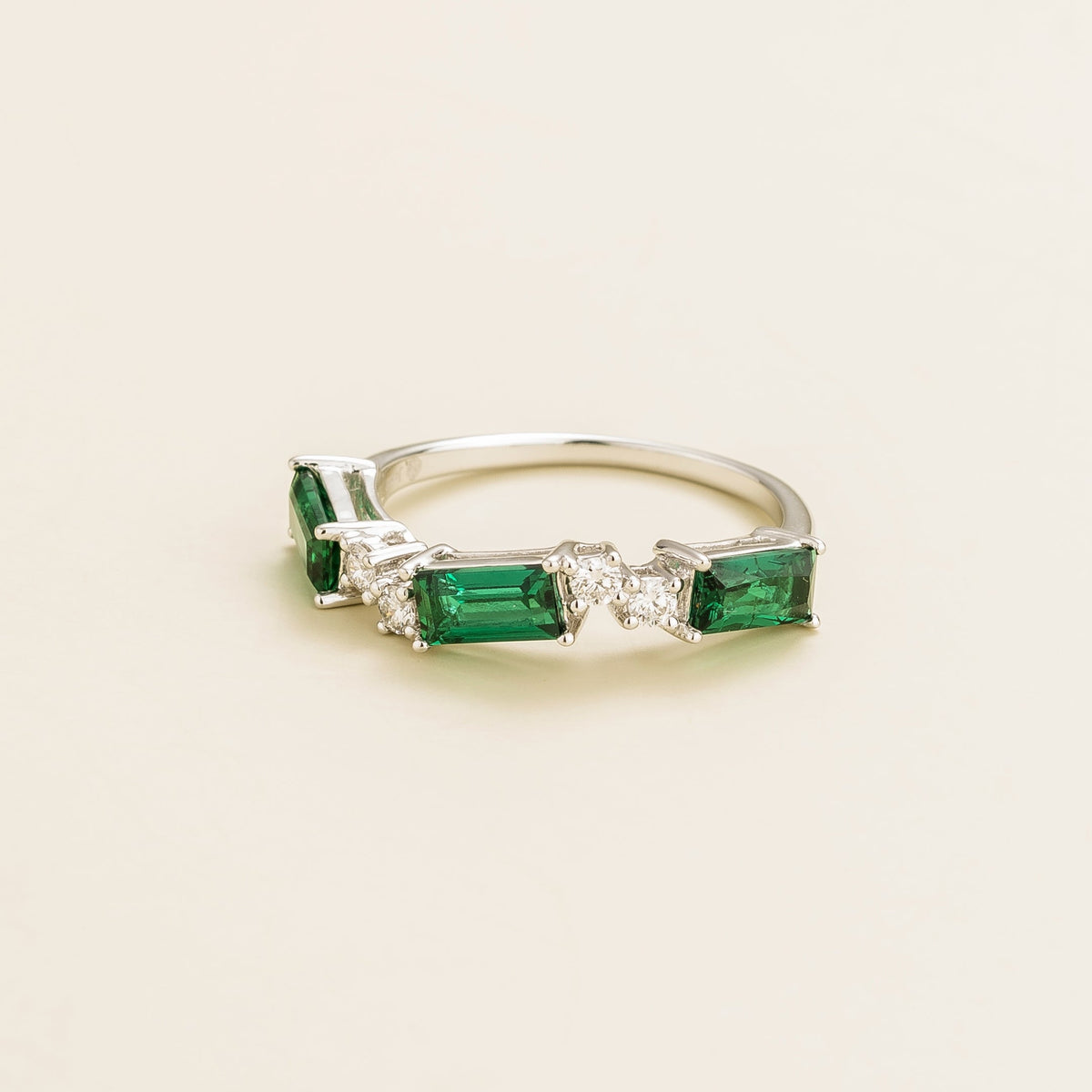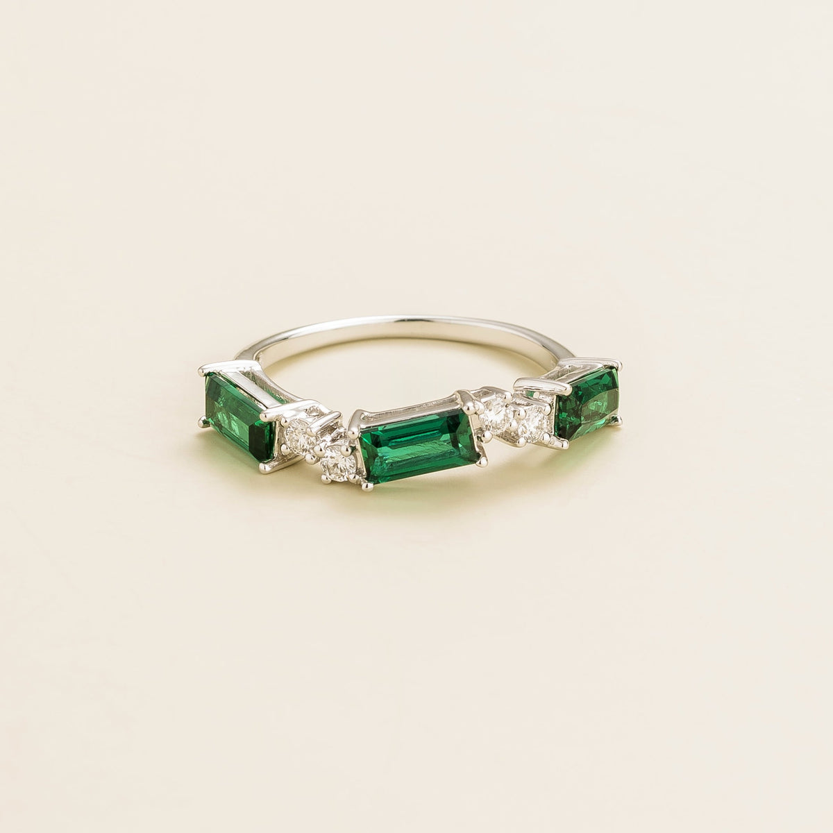 This band ring is crafted from 18K white gold vermeil. It features three 6x3mm baguette-cut emeralds totaling 1.45 carats and four 2mm round VS-grade diamonds totaling 0.16 carats. The set gemstone dimensions are 4.8mm wide x 3.8mm deep, with a band measuring 1.7mm wide x 1.5mm thick.