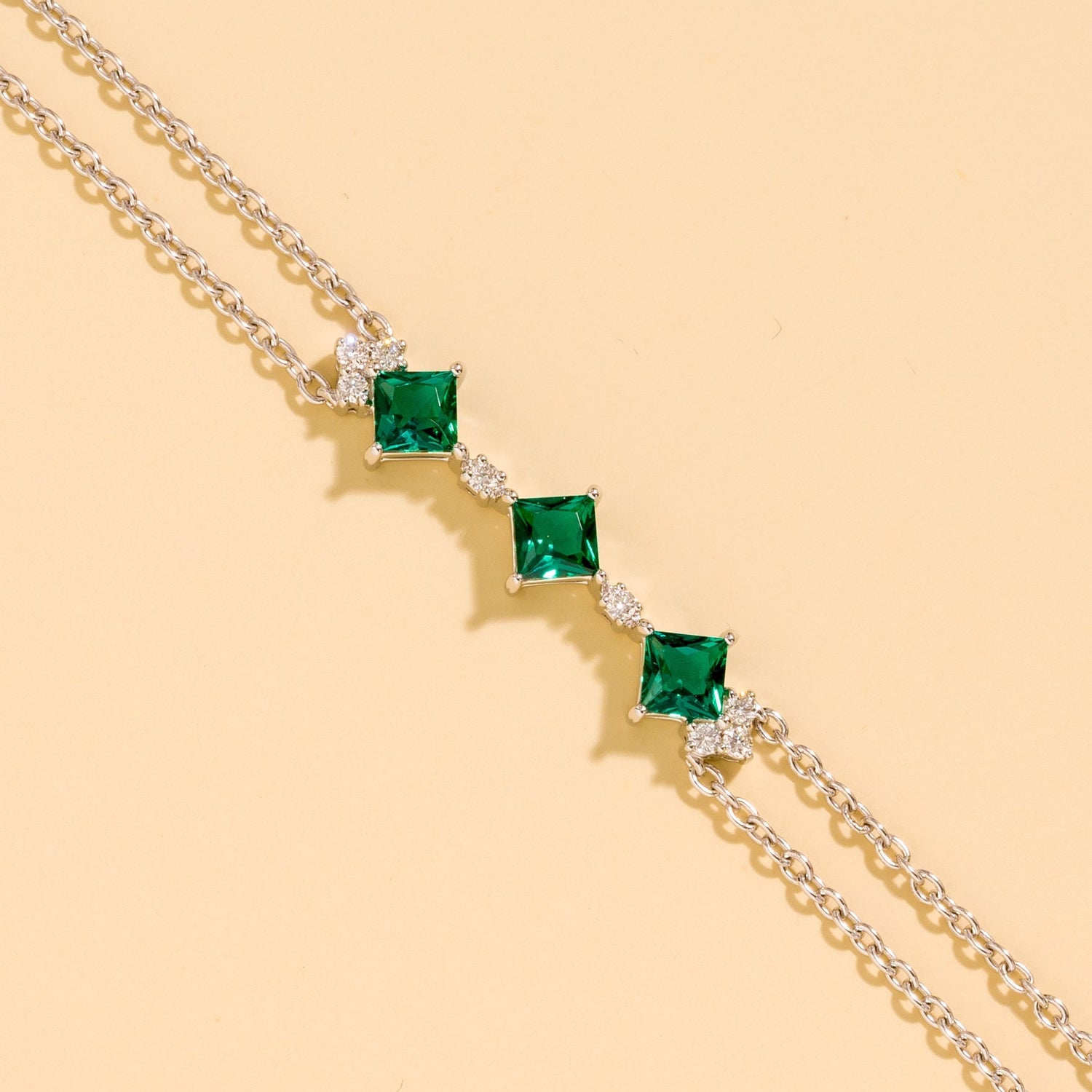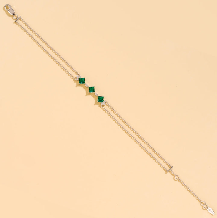 This bracelet is a double-chain design made from 18K white gold vermeil. It is set with three 4mm princess-cut emeralds totaling approximately 0.94 carats and VS grade diamonds totaling approximately 0.32 carats. The length is adjustable from 6.5-7.5 inches.