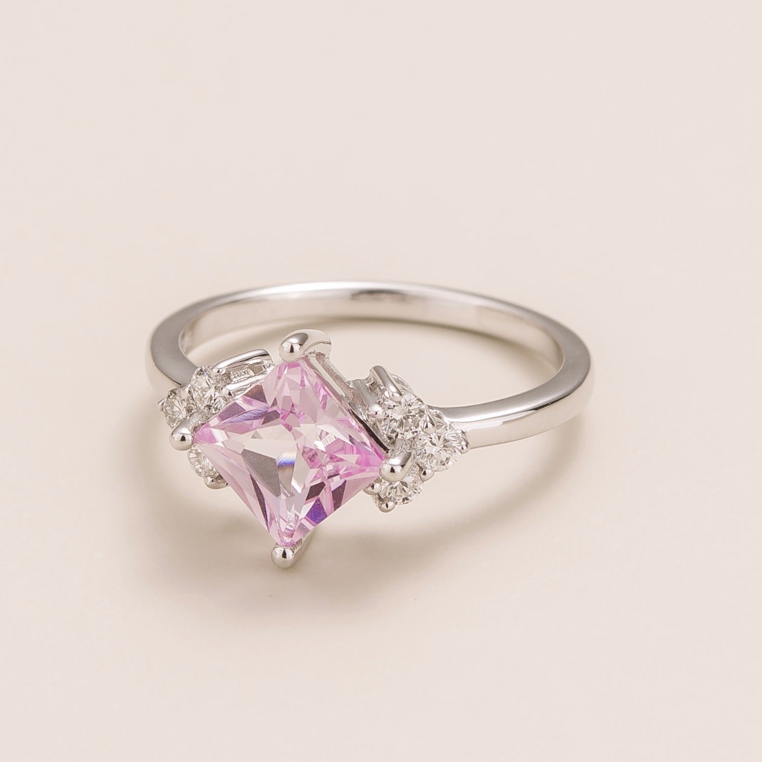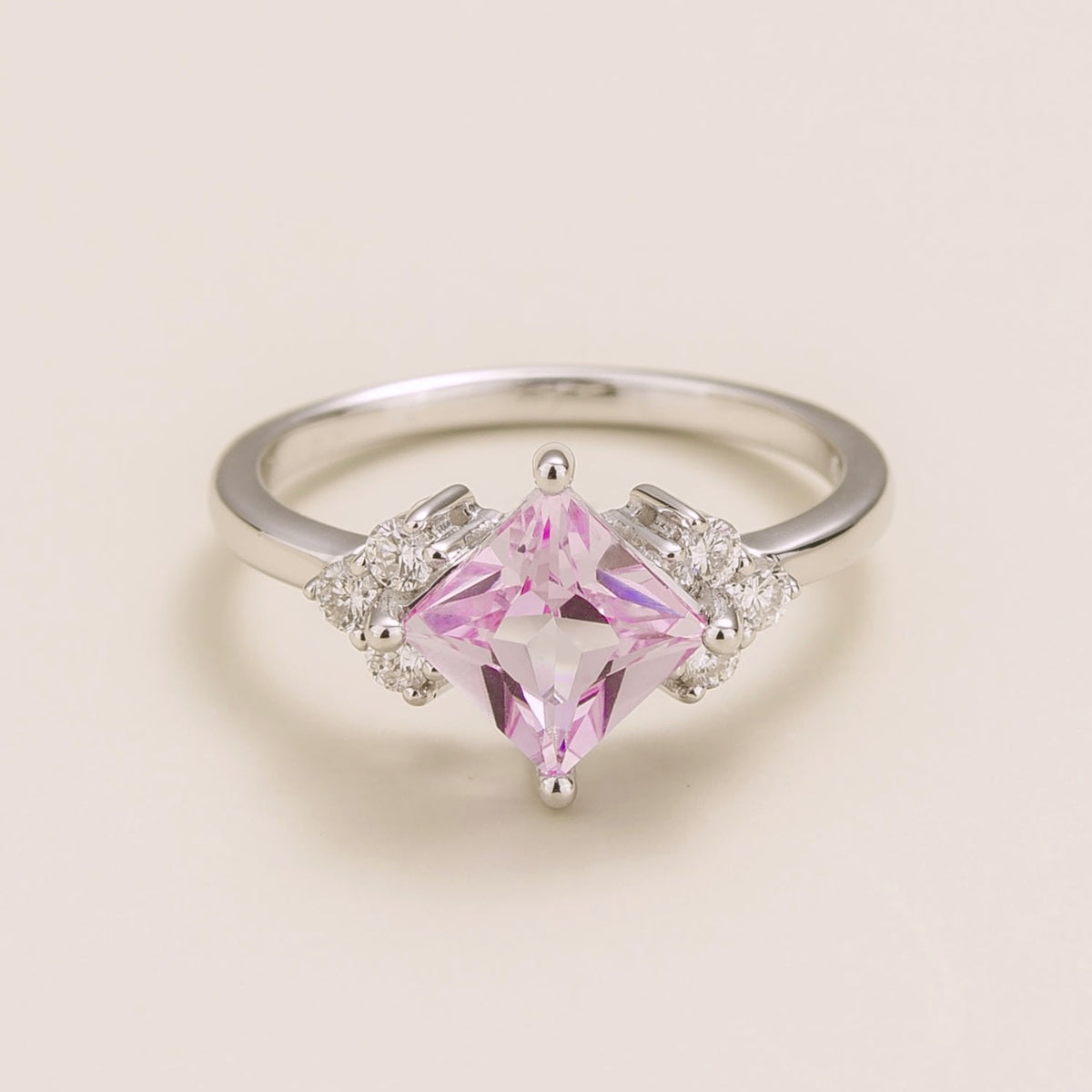 This fine ring is crafted from 18K white gold vermeil. It features a 1.30-carat princess-cut pink sapphire and diamonds totaling 0.24 carats. The crown measures 13.6mm high by 9.6mm wide.