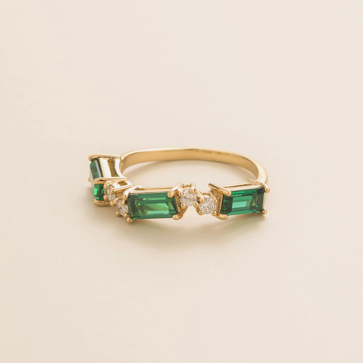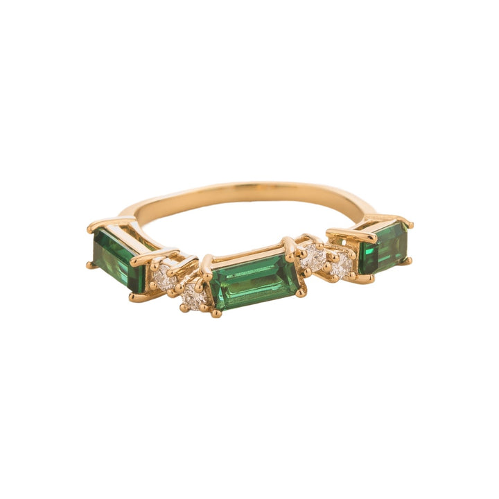 This Forma Ring In Emerald & Diamond by Juvetti is a celebration of contemporary artistry and luxury. This meticulously crafted band ring is designed to showcase your unique style with its striking arrangement of baguette-cut emeralds and round diamonds. The piece is both modern and elegant, perfect for adding a touch of artistic allure and vibrant color to your collection.