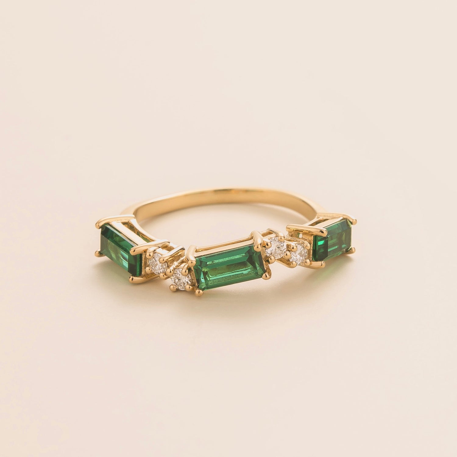 This ring is crafted from 18k gold vermeil and features three baguette-cut emeralds (approximately 1.45 carats) and four round brilliant diamonds (approximately 0.16 carats, VS grade). The band measures 1.7mm in width.