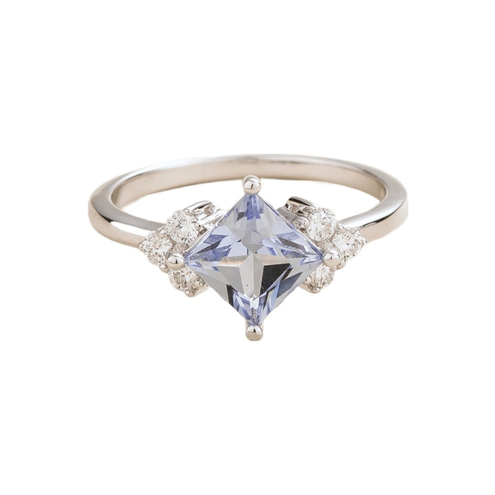 This ring is crafted from 18K white gold vermeil and set with a ~1.30 carat (6mm x 6mm) princess-cut Ceylon blue sapphire and ~0.24 carats of VS-grade diamonds. The crown dimensions are 13.6mm height x 9.6mm width x 5.0mm depth, and the band is 1.7mm width x 1.6mm thick.