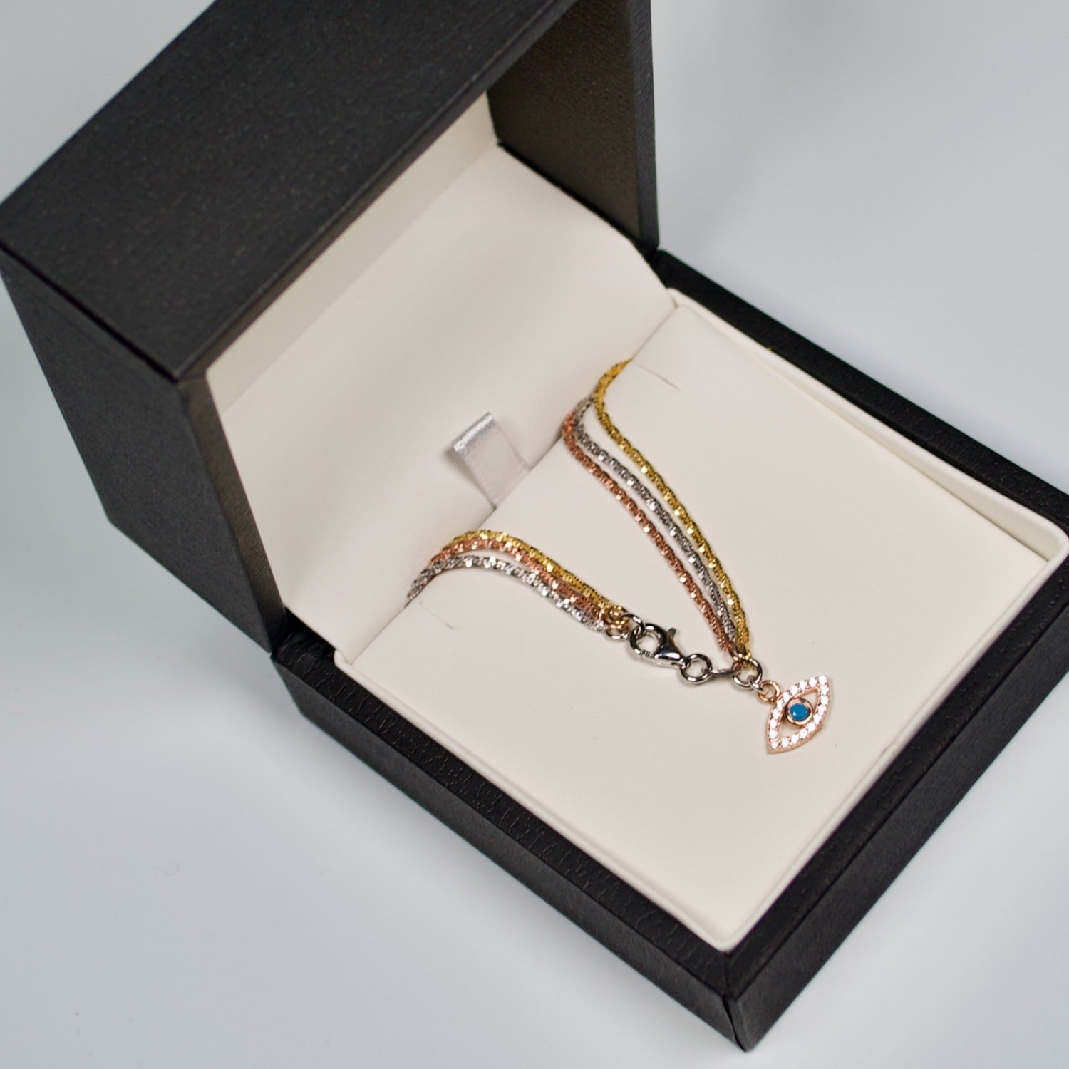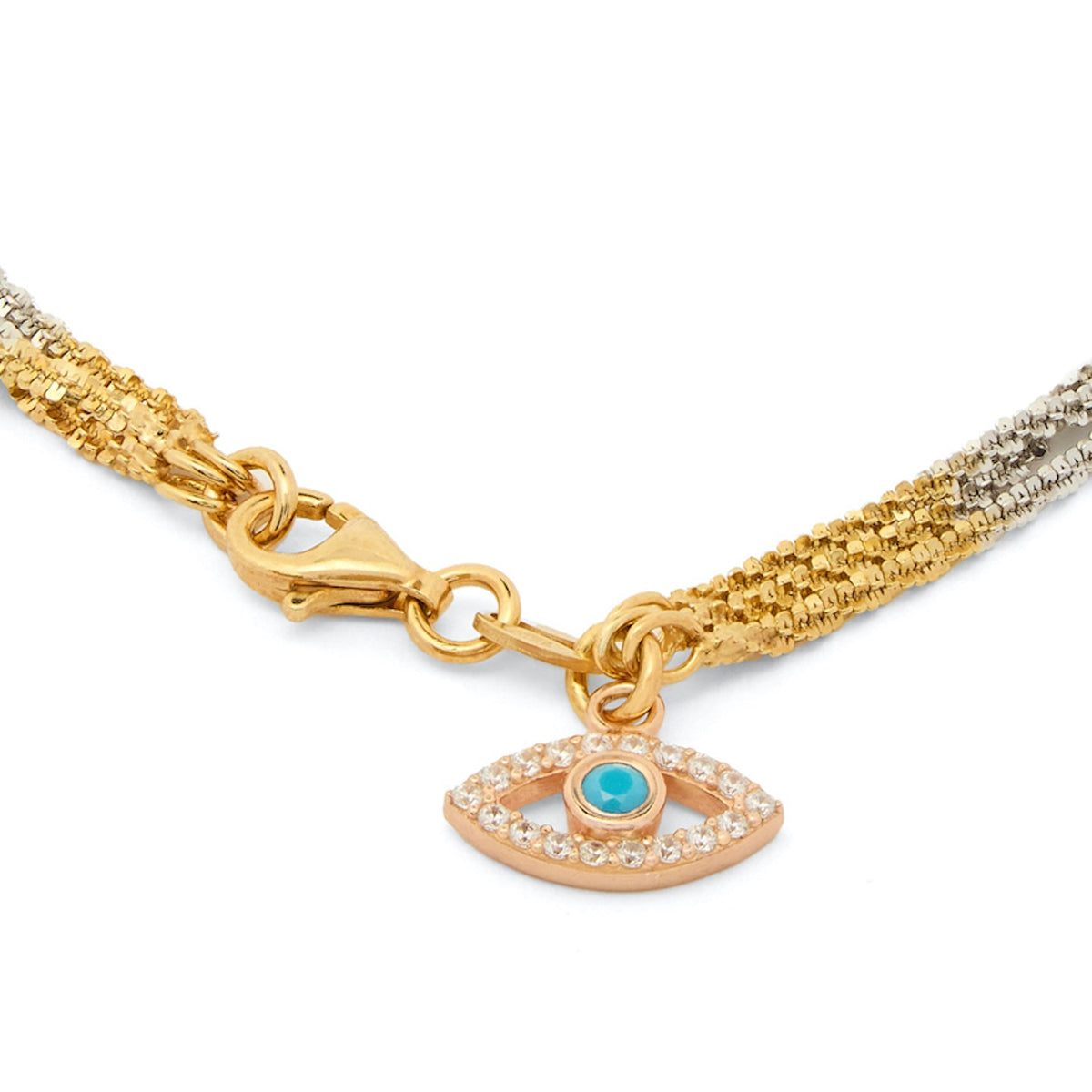 Triple Gold, Silver And Rose Gold Bracelet With Evil Eye Charm Drop