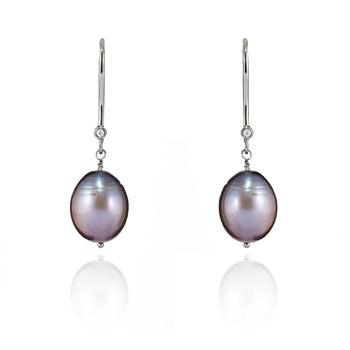 These earrings are handmade and set in 18k white gold. They feature stunning dark grey freshwater pearls and a single natural diamond.