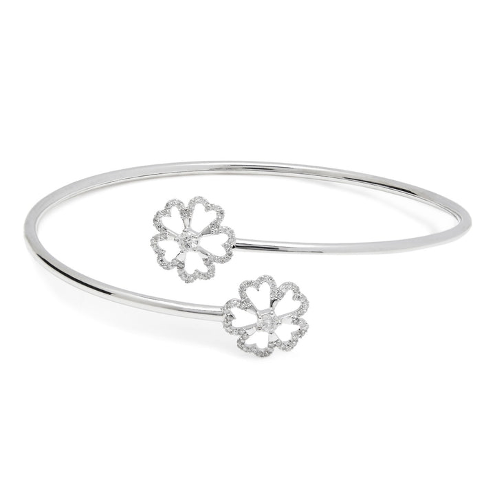 The Open Flower Bangle by Kaizarin is a beautiful and delicate open bracelet designed to fit most wrist sizes. It features brilliant round diamonds set in intricate 18-karat white gold flowers, which are connected to a sterling silver bangle. The design is comfortable and light, making it a versatile piece that can be worn for any occasion, from day to night.