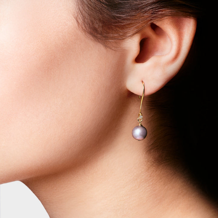 Handcrafted in London from 18k yellow gold, these earrings feature grey freshwater pearl drops and a natural diamond. Each piece is stamped by the UK Assay Office with the maker’s mark and 750 hallmark.