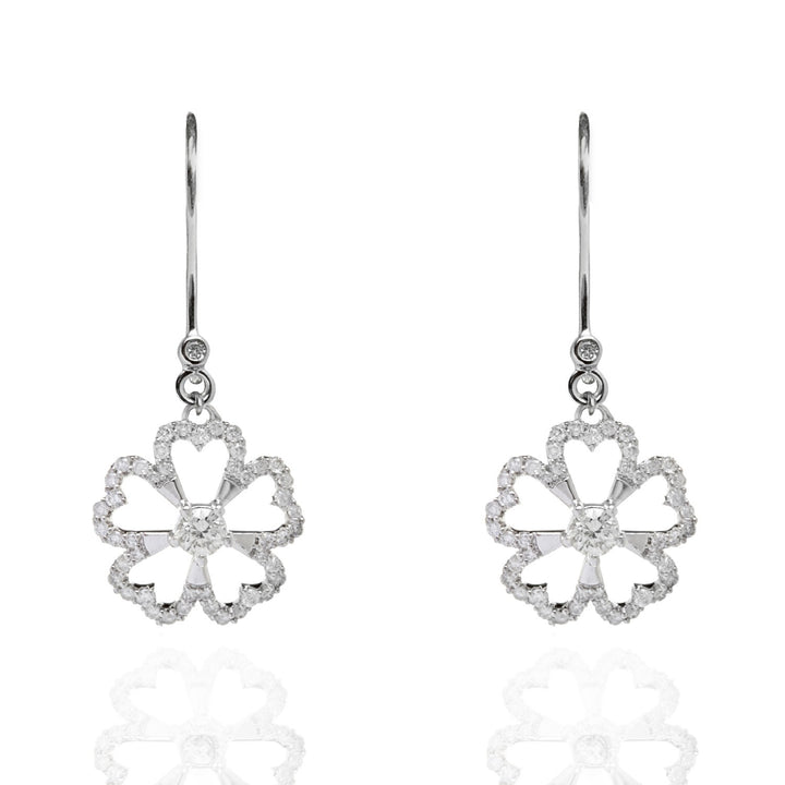 These Twin Dangly Flowers Diamond Earrings by Kaizarin are a delicate and luxurious accessory. The graceful dangling flower design is crafted from 18-carat white gold and adorned with striking white diamonds. This timeless piece is perfect for adding an elegant and classy touch to any outfit, whether for a special occasion or everyday wear.