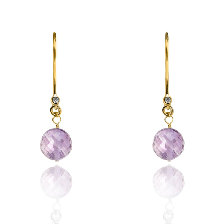 These earrings are handmade in London and feature a gold-colored metal with amethyst gemstones.
