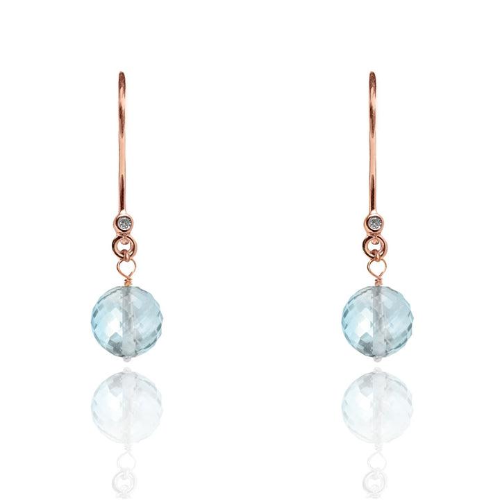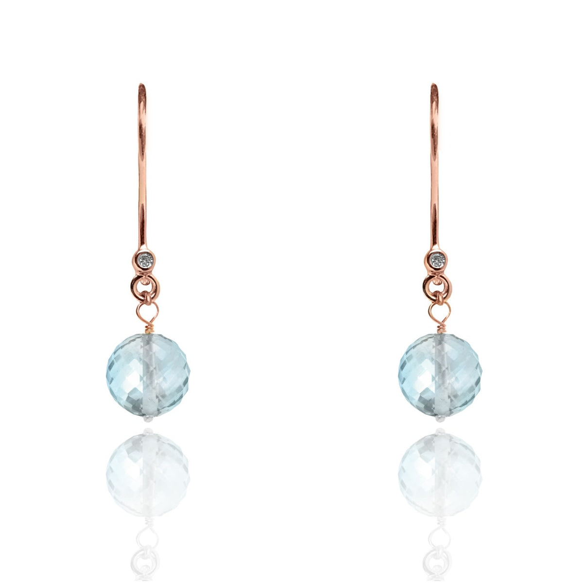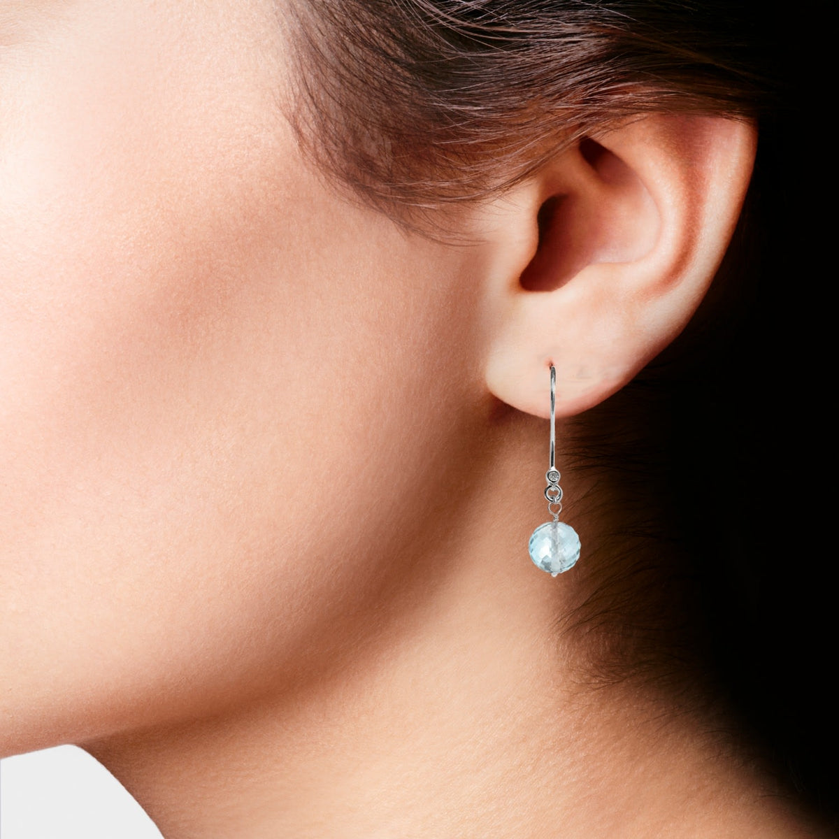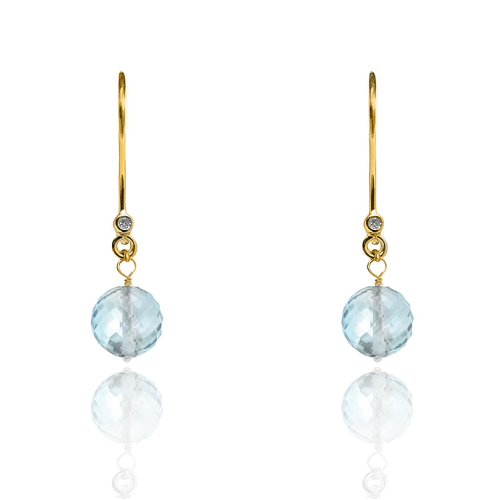 These earrings are handmade in London with 18ct gold, aquamarine, and a single diamond.