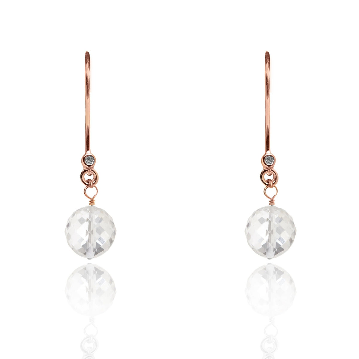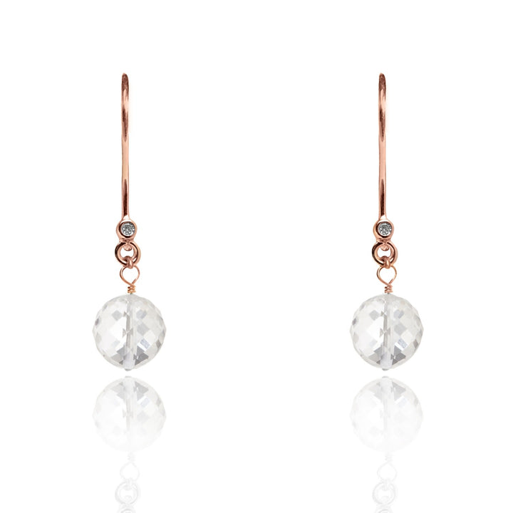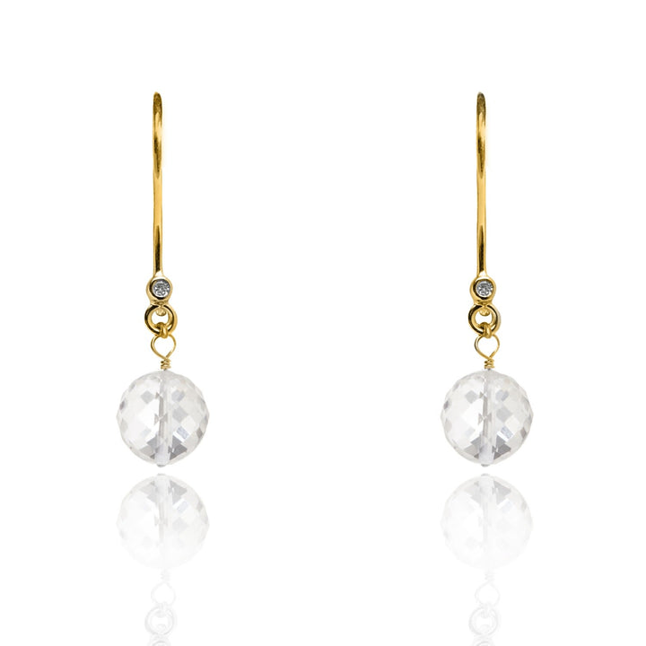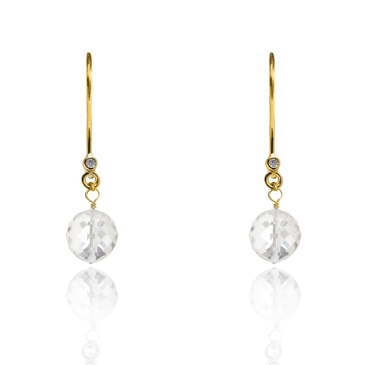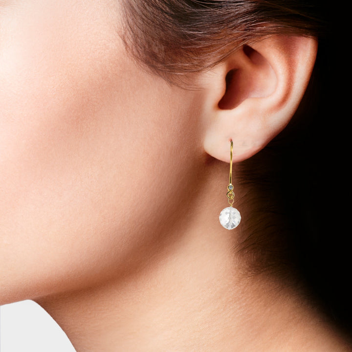 These April Birthstone Earrings In Clear Quartz by Kaizarin are a stunning and elegant accessory. The design features a clear crystal as a substitute for a diamond, offering an affordable yet beautiful option. Set in 18ct gold with a single diamond, this piece is believed to provide protection and make you look everlastingly beautiful.