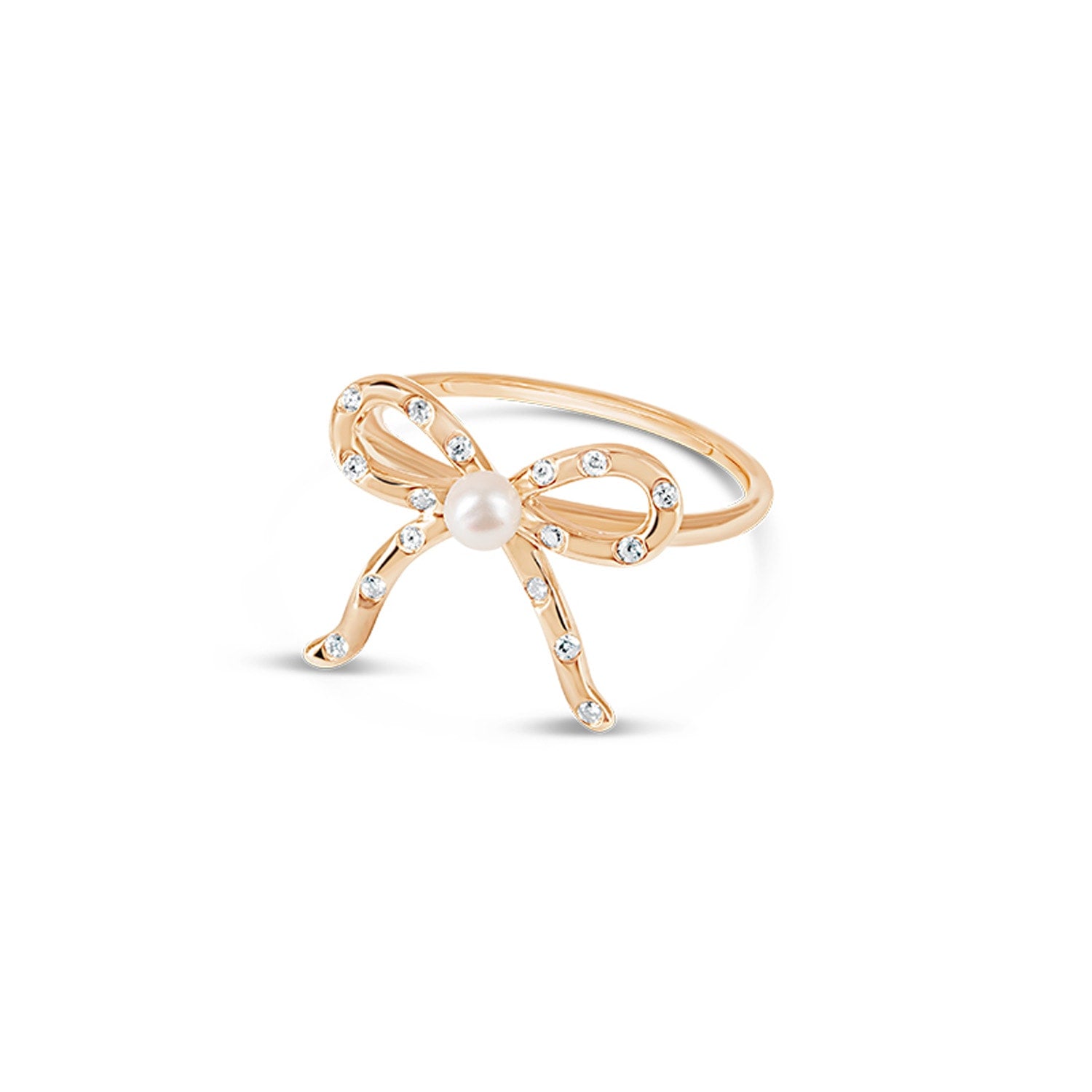 This Blushing Bow Ring by Kajal Naina adds a playful touch of elegance to any hand. The dainty yet strong bows are available with sparkling diamonds or vibrant rubies, centering a luminous pearl. This ring's timeless design with a touch of coquette charm makes it a versatile piece that can be worn for both everyday style and special occasions.