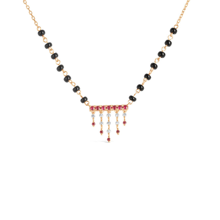 This mangalsutra is a smaller-sized necklace with a combination of ruby and diamonds. The description mentions "gold and diamond jewellery," but does not explicitly state the metal type. It also includes black beads.