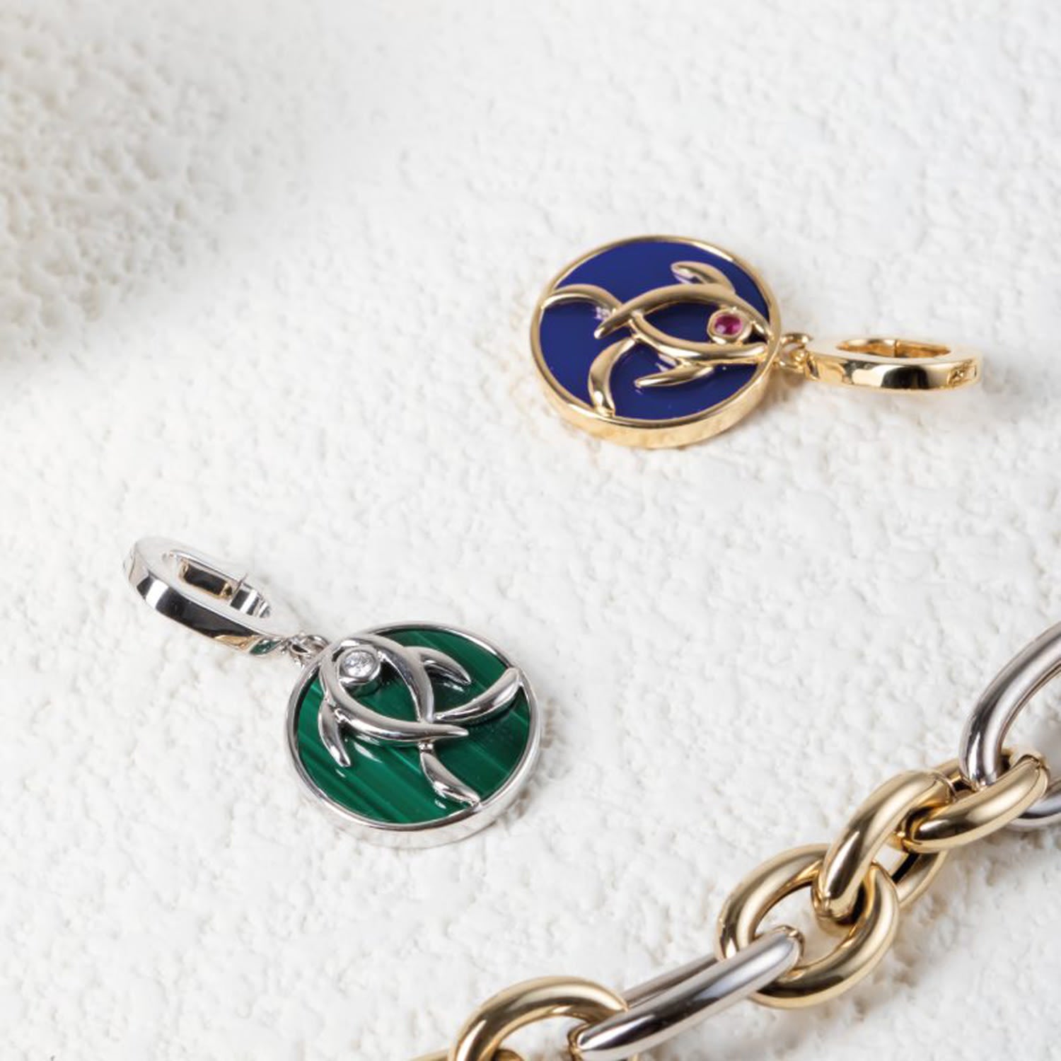 This charm is described as "fine jewellery" and "gold and diamond jewellery" but the specific metal is not stated. It features a gemstone eye.