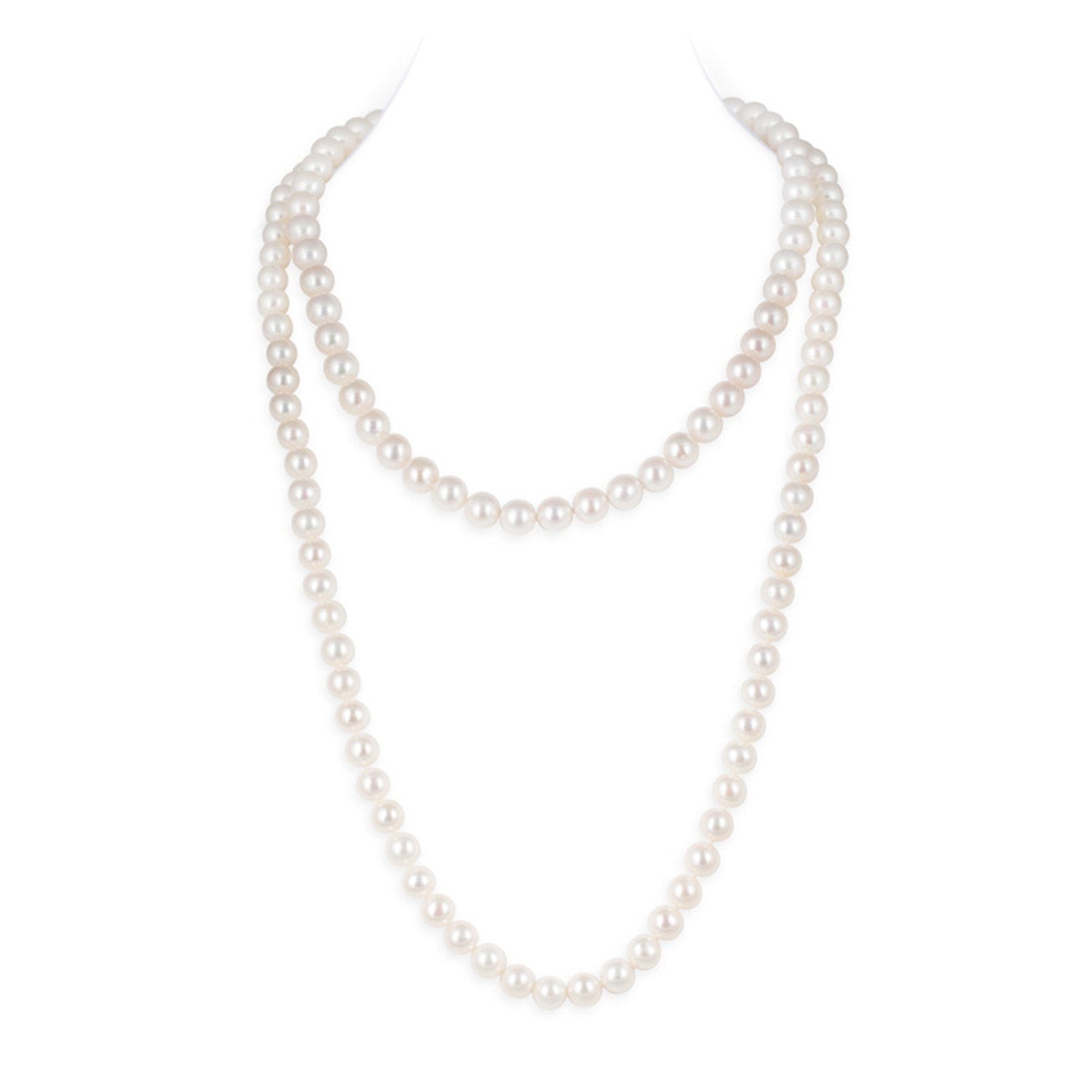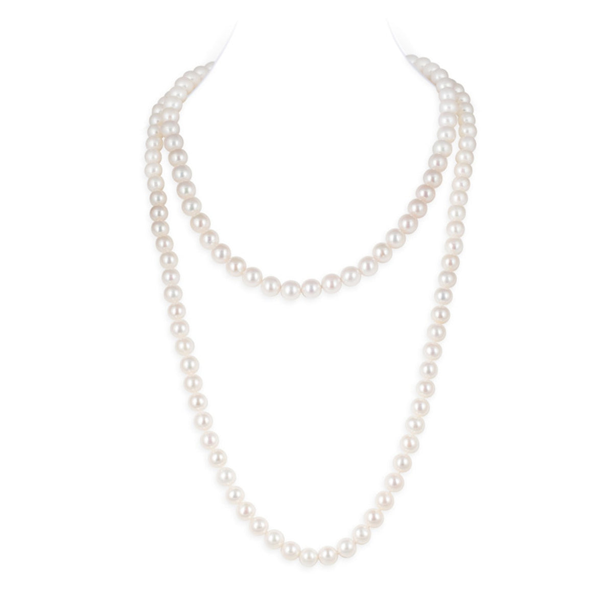 This necklace is made with freshwater pearls that are individually knotted on twin silk.