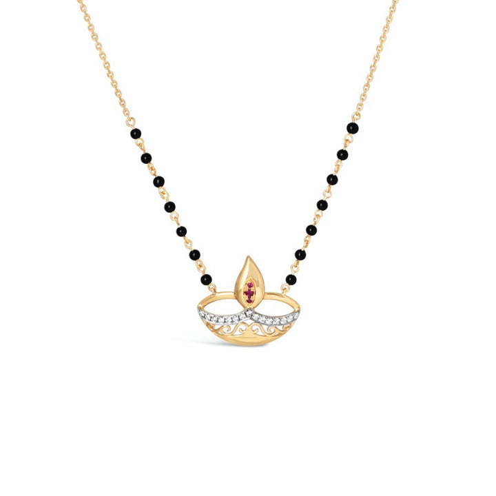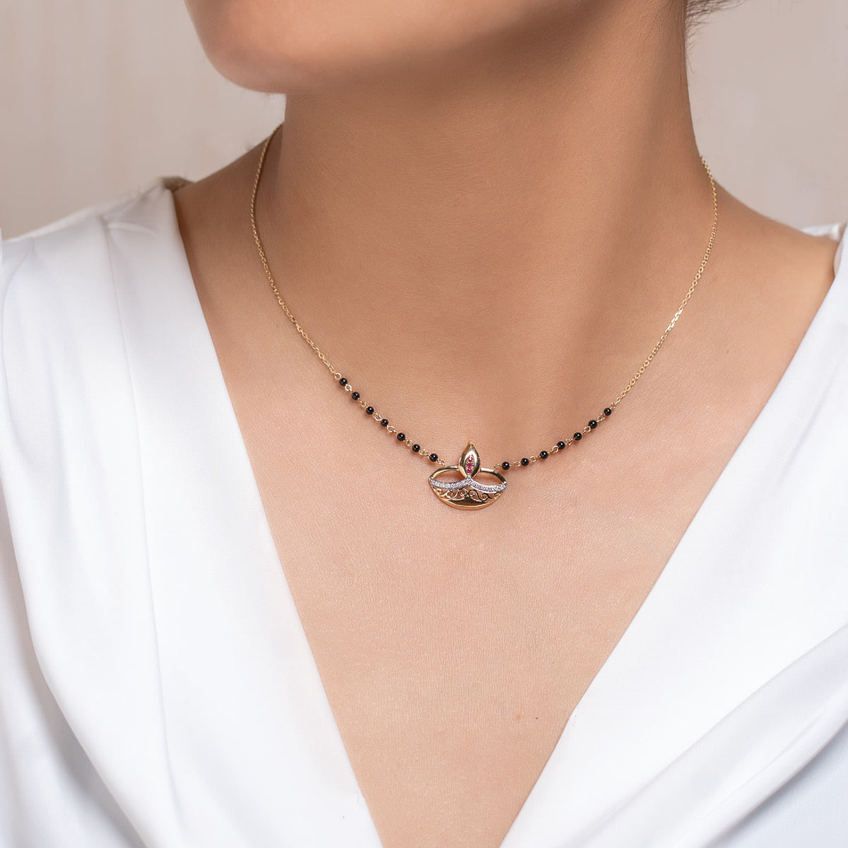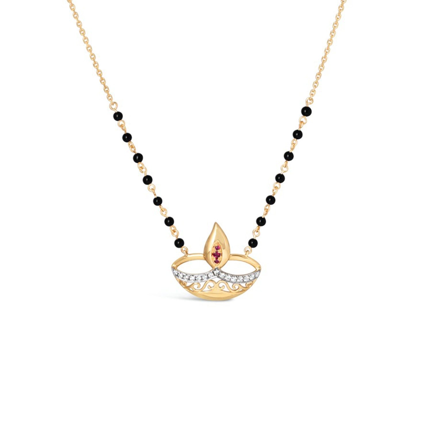 This Diya Jyoti Mangalsutra by Kajal Naina is a fine necklace inspired by the warmth and security of a "Diya," or traditional lamp. It symbolizes a protective shield and the light that burns away negative emotions. Wearing this mangalsutra is meant to evoke feelings of warmth, calmness, and love, reminding the wearer of the beautiful moments of their marriage.