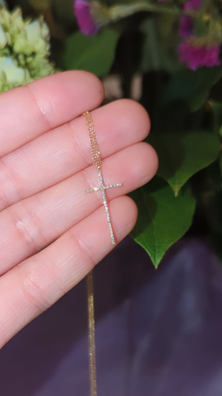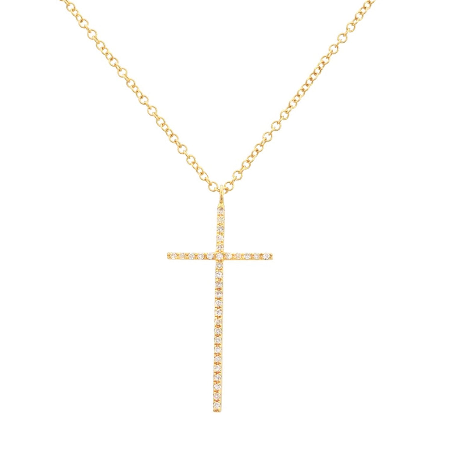 This necklace features a cross pendant made of 14k yellow gold and is set with 0.07 carats of natural diamonds. The pendant dimensions are 23.5 x 12mm.