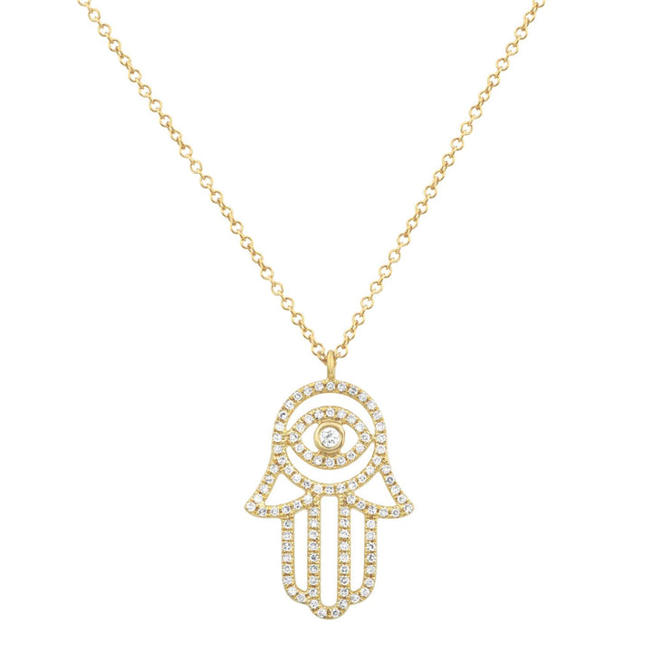This pendant necklace is made from 14-karat yellow gold. It is set with 0.23 carats of diamonds. The hamsa hand charm measures 19.5mm x 13.8mm, and the chain is adjustable from 16 to 20 inches.