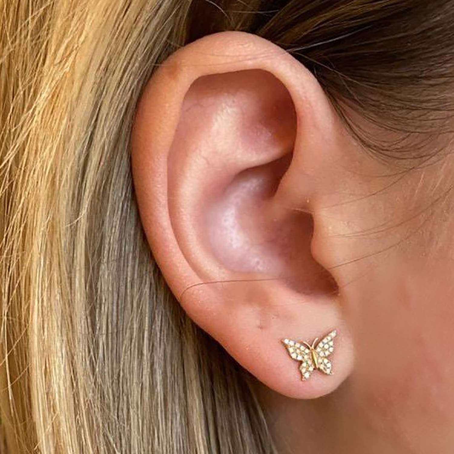 These Asymmetric Butterfly Studs by Kamaria are a fun and modern accessory. The butterfly represents hope and transformation, and this design allows for a versatile look. You can wear the single butterfly on one ear and the double flutter on the other, or stack them on one ear for a statement. These studs are made with diamonds set in 14k yellow gold, making them a luxurious and meaningful addition to your collection.