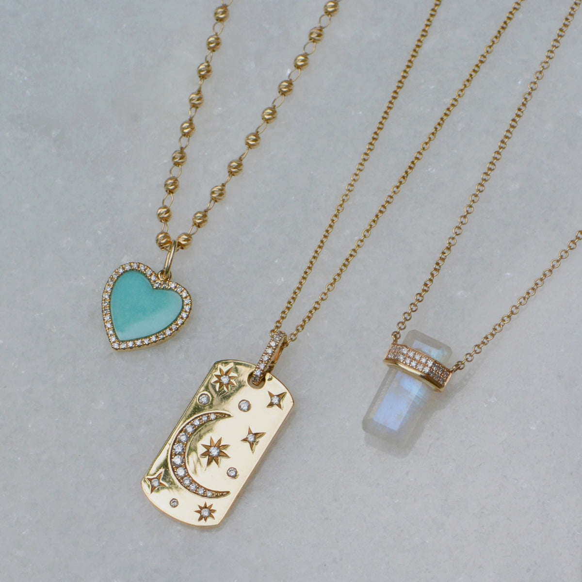 This Turquoise Heart Necklace by Kamaria is a stunning and versatile piece, perfect for summer. The necklace features a beautiful turquoise heart set with diamonds in 14k yellow gold. The bold and sparkly paperclip link chain can be clasped at any length, making it a highly adjustable accessory. This piece is also a meaningful purchase, as every sale supports survivors of campus sexual assault.