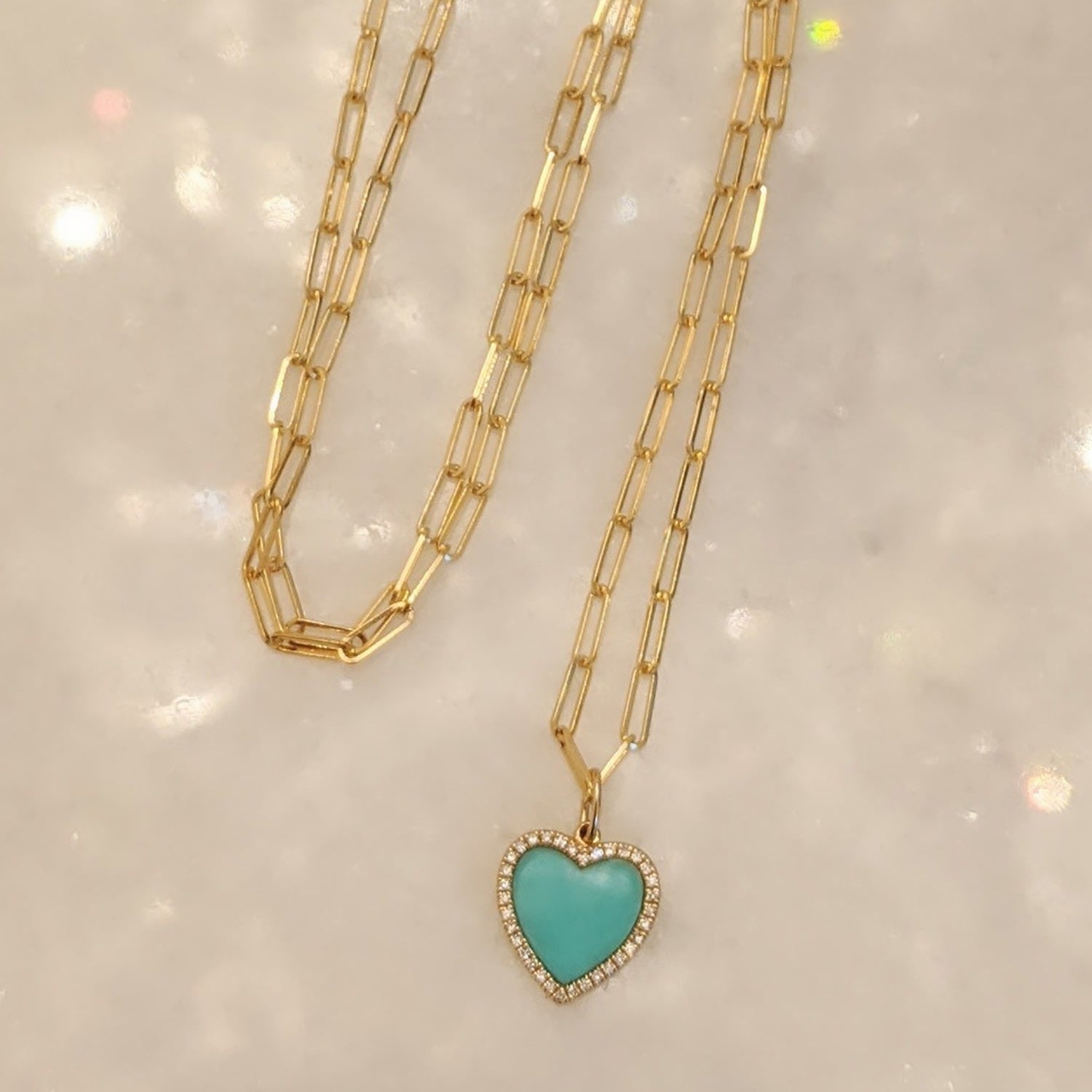 Turquoise Heart Necklace With Diamonds On Paperclip Link Chain