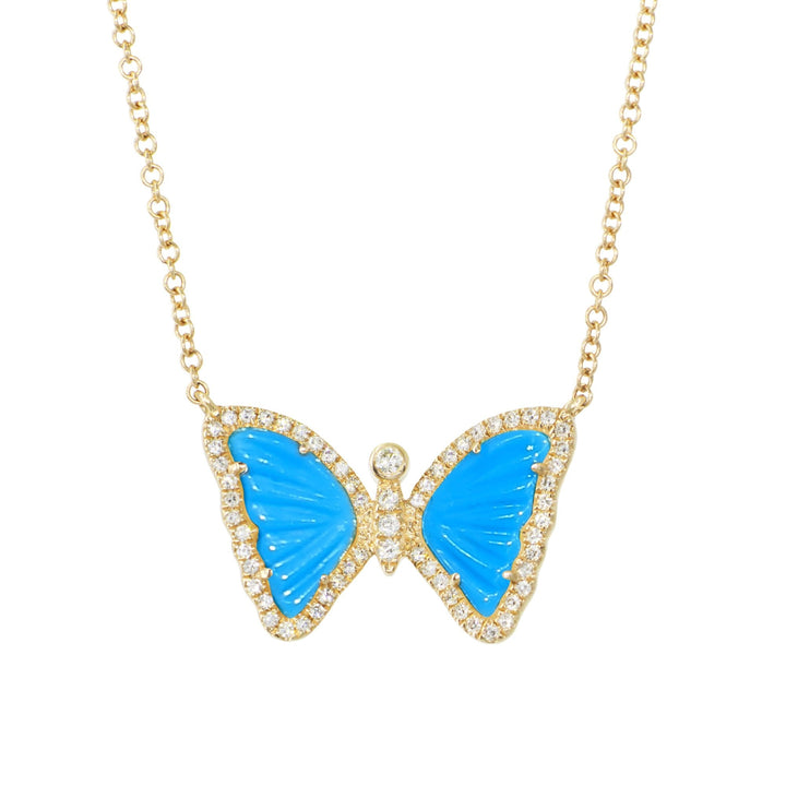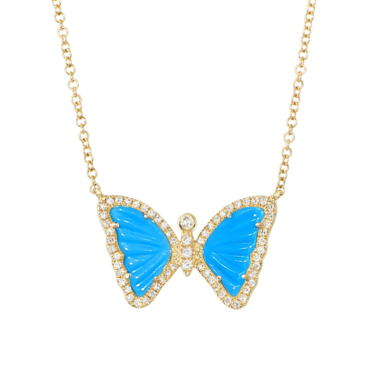 This necklace is made from 14k yellow gold and features a Turquoise (0.96ct) butterfly pendant and Diamonds (0.15ct). It has an 18-inch (46cm) gold chain with an adjustable slider.