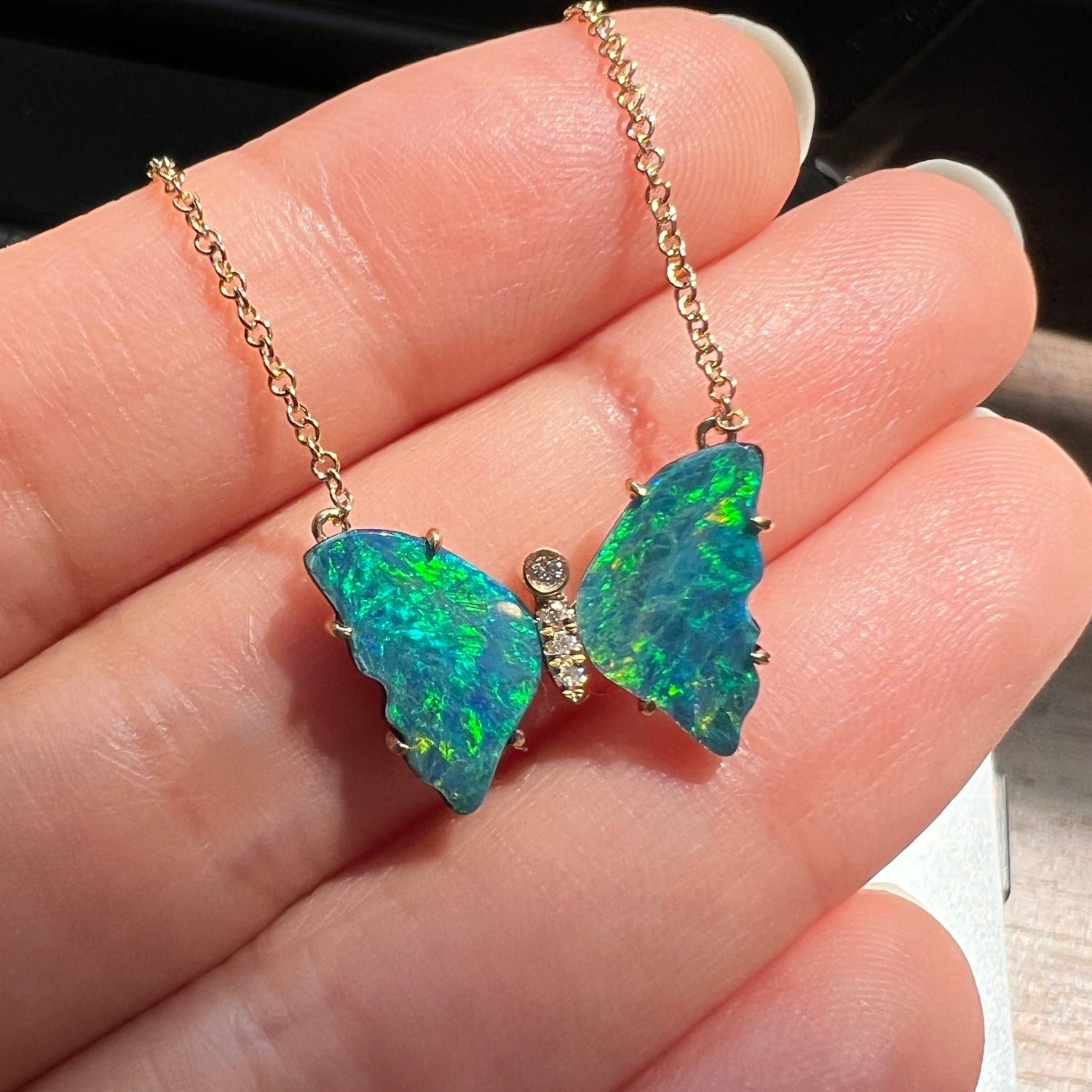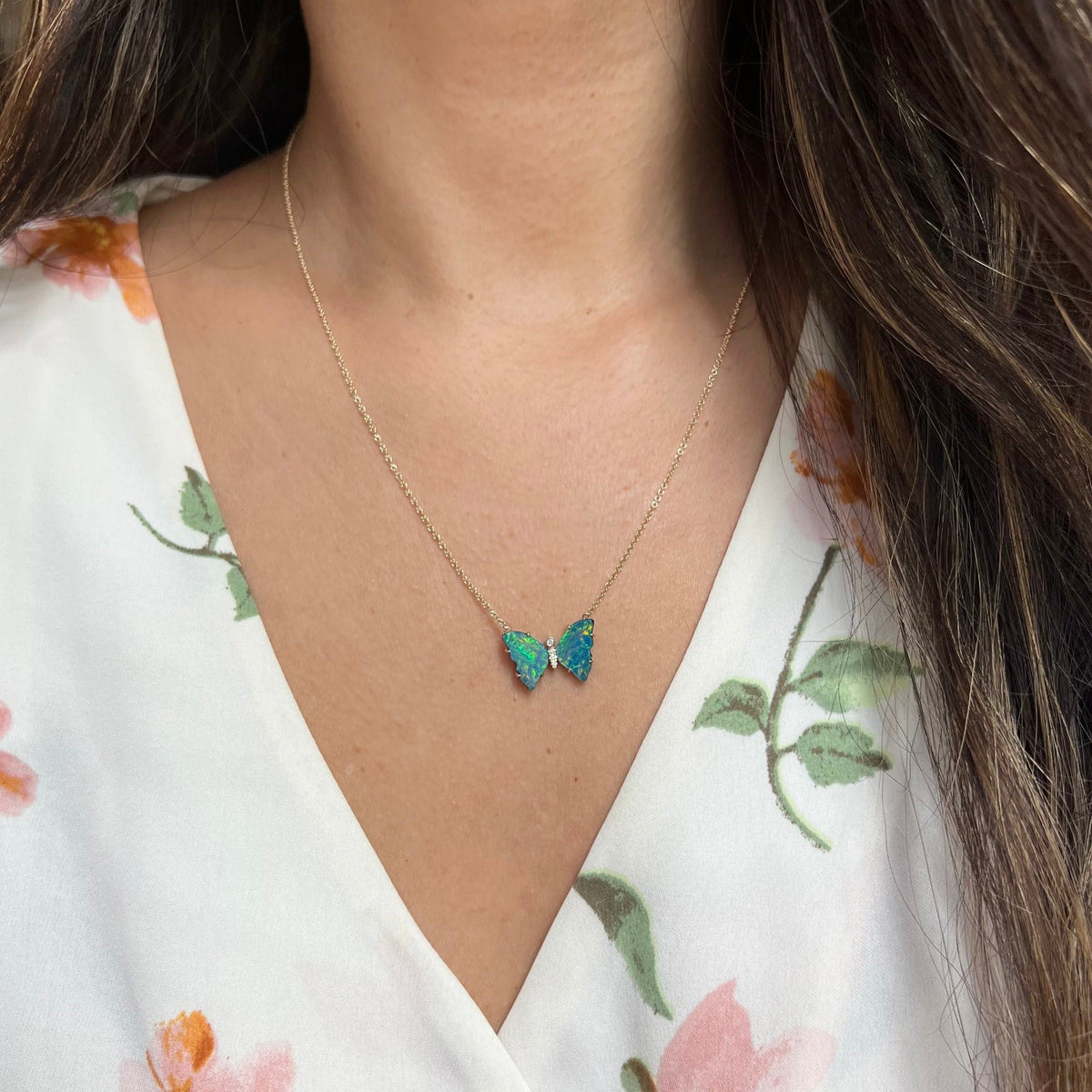Opal Butterfly Necklace With Diamonds & Prongs - Earth Green