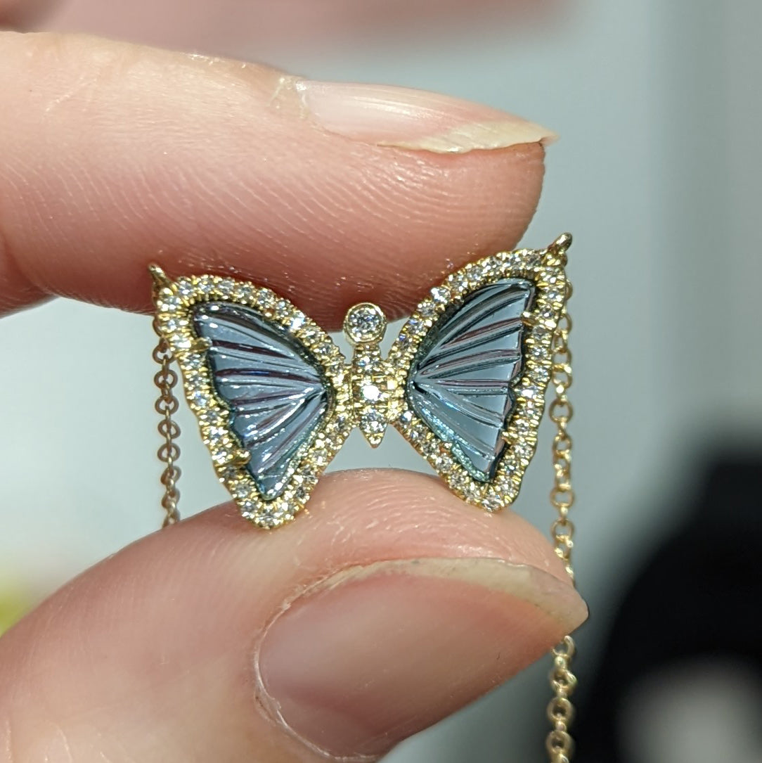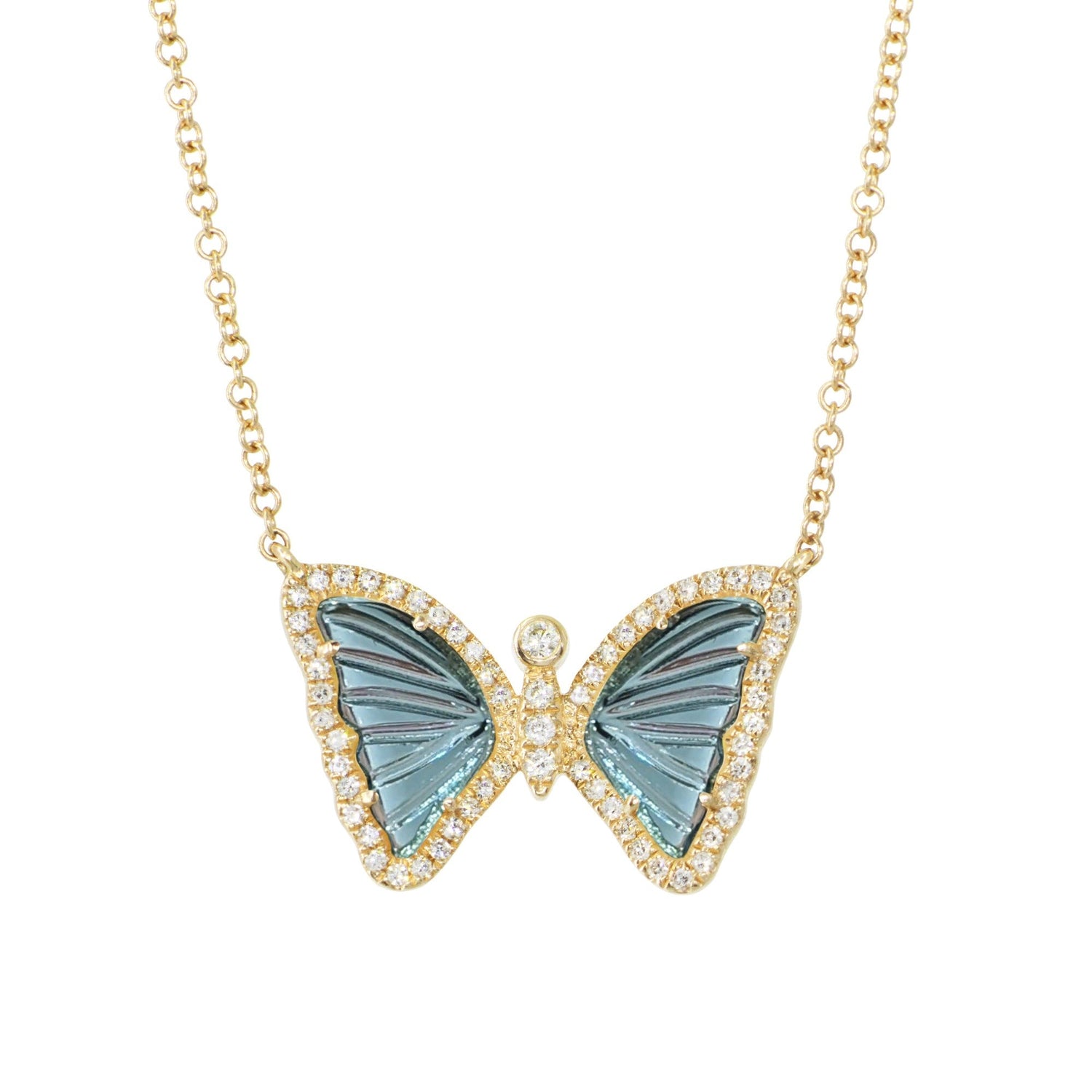The Mini London Blue Topaz Butterfly Necklace With Diamonds by Kamaria is a truly stunning and symbolic piece. It features a butterfly pendant with a beautiful, deep-hued London blue topaz set with mini diamonds. The butterfly represents hope and transformation, while the blue topaz symbolizes honesty and clarity, making this a meaningful accessory.